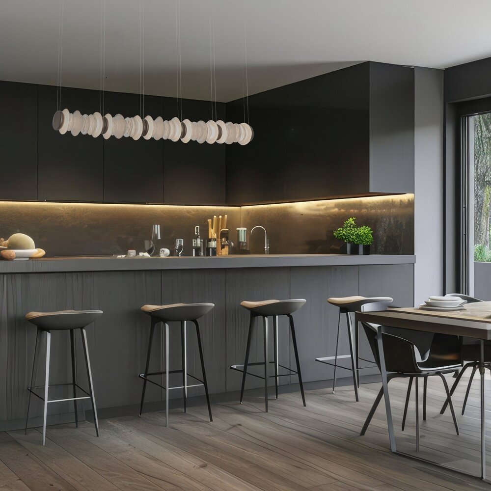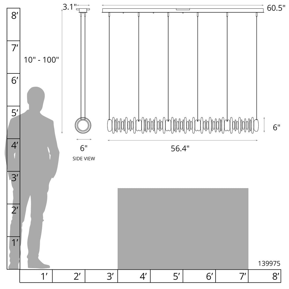An addition to the Cairn Collection, this pendant tips the vertical glass "stone" stacks to a horizontal in this wonderful linear version. Round, textured clear and bubble glass of varying diameters are positioned side by side. Each of five "stacks" is bookended by metal, stone-shaped LED modules to great visual effect. Cable-hung, the Cairn Linear LED Pendant boasts a 4.7ft expanse, creating a stunning piece that is at home over a kitchen island, bar or reception counter, a dining table, a billiards table, and more.