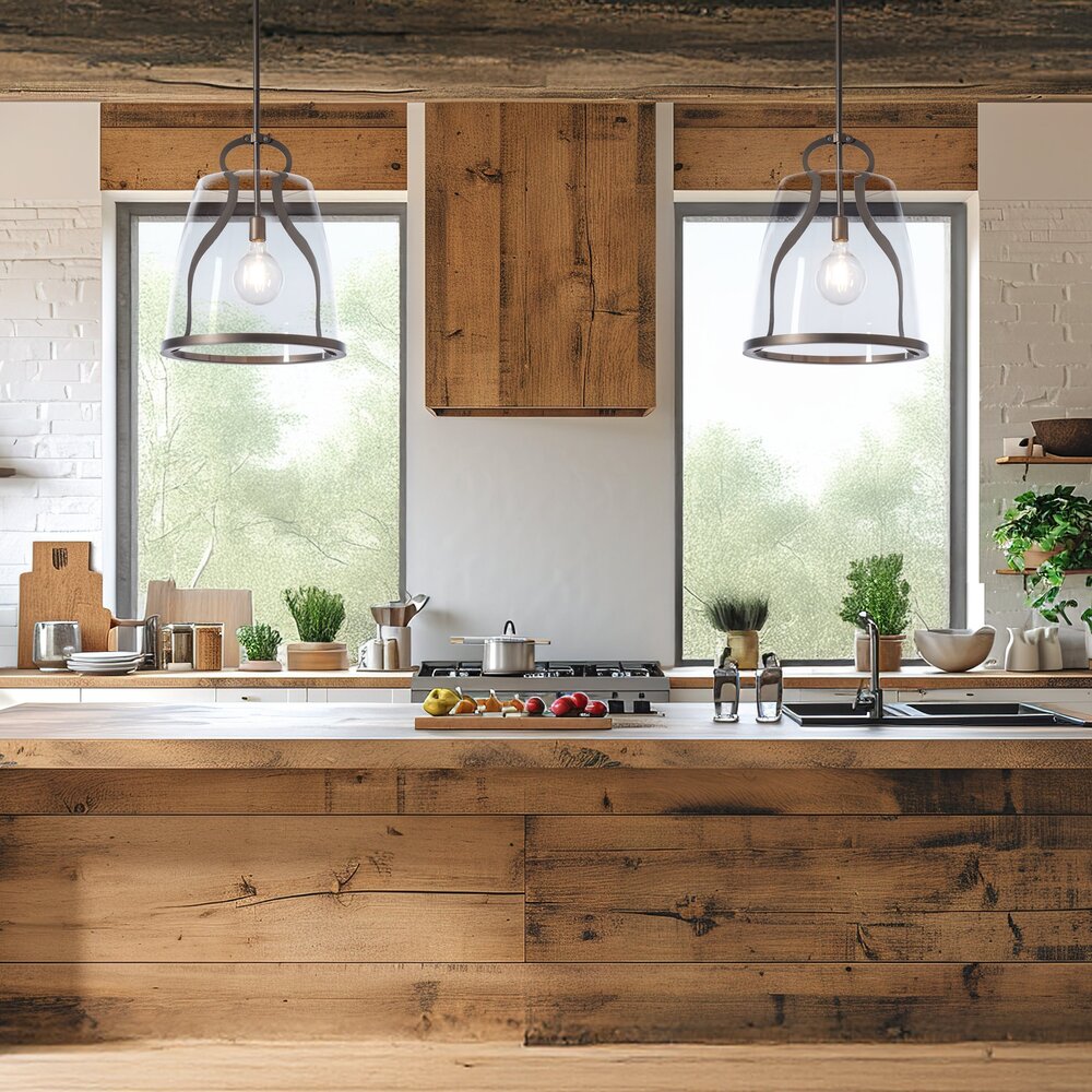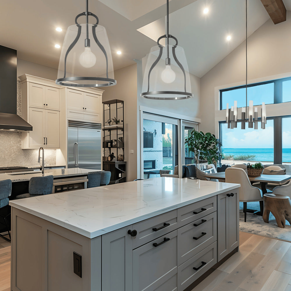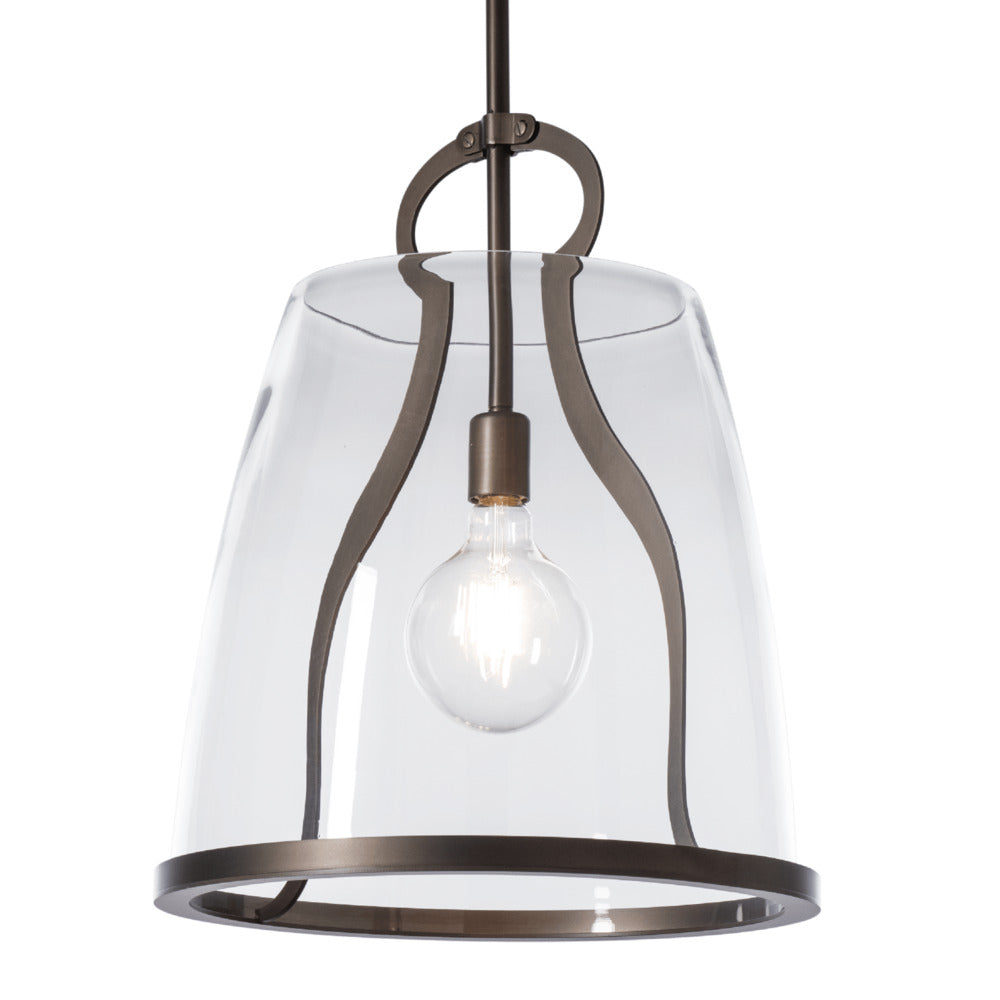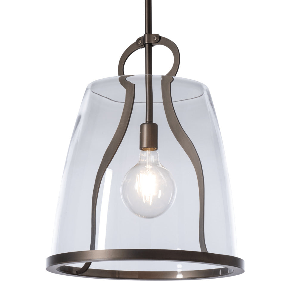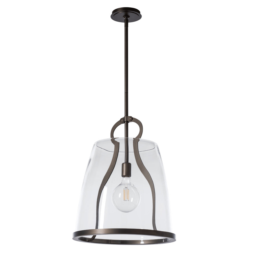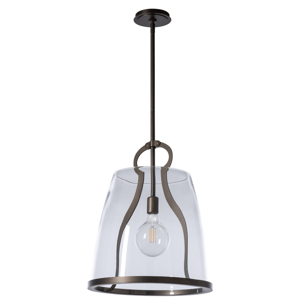This large Caliper Pendant gives scale to our popular design. At over 16" in diameter, this Caliper is large enough to hang as a single fixture in a breakfast nook, or a double over most kitchen counters. With the metal feature designed to resemble an antique tool, the Caliper's large glass shade is supported by this "tool" and lower metal rim.