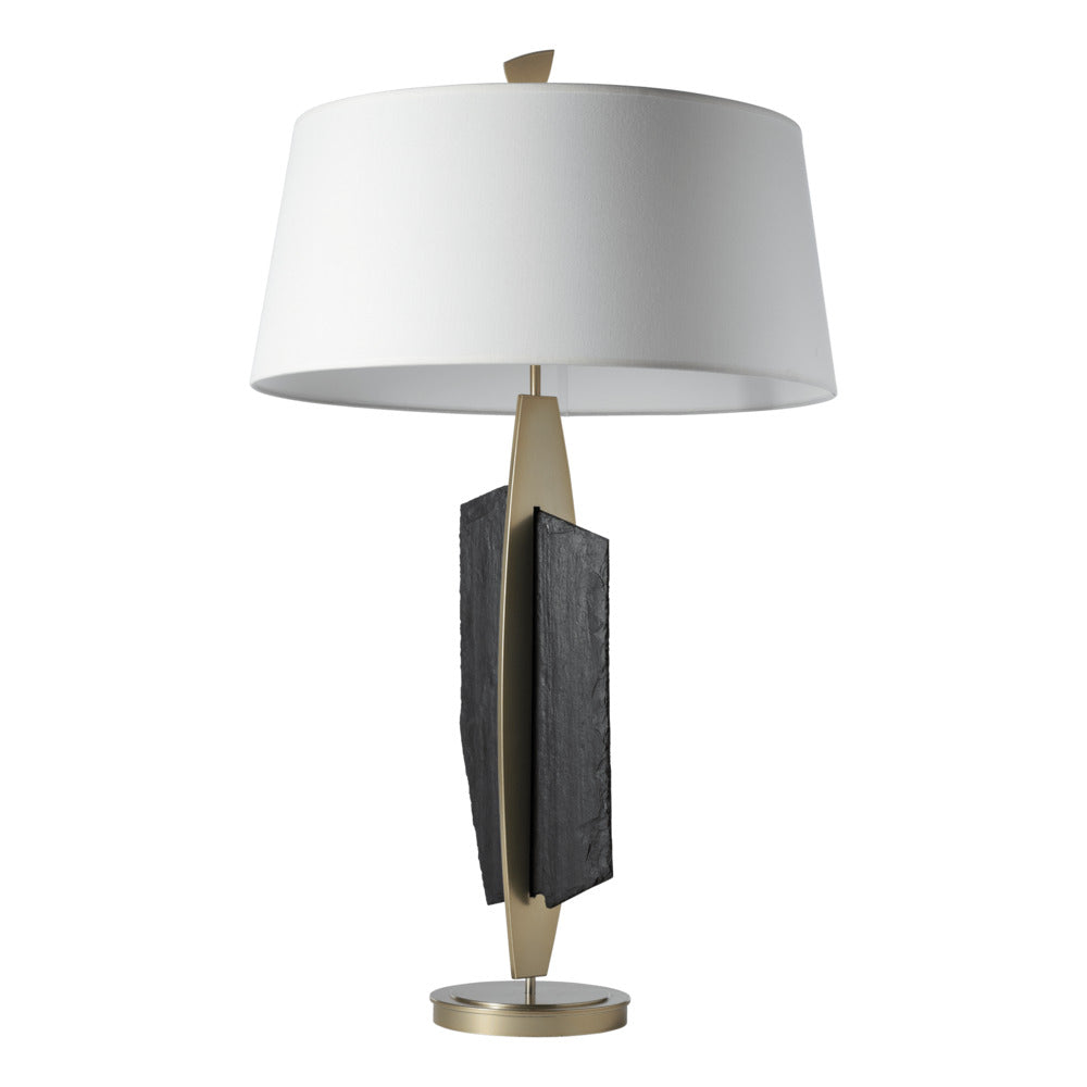 The Cambrian Table Lamp is where art and functionality collide, but where the harmony of ruggedness and refinement are on display in equal measures. This lamp celebrates the beauty of Vermont black slate by showcasing its textural variations resulting from the splitting and shaping process. The slate intersects with the strong vertical form of steel, creating a striking visual contrast that adds a touch of elegance to any space.