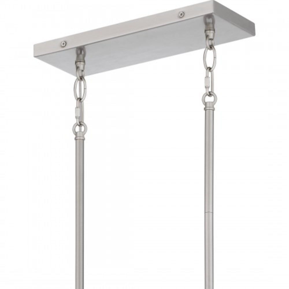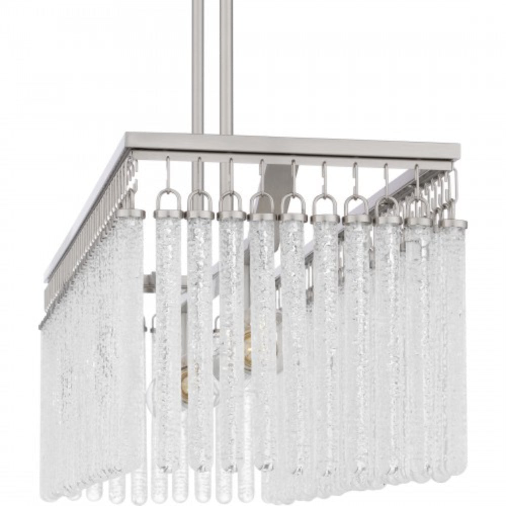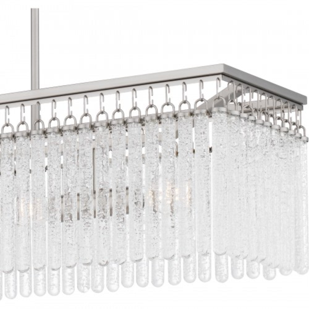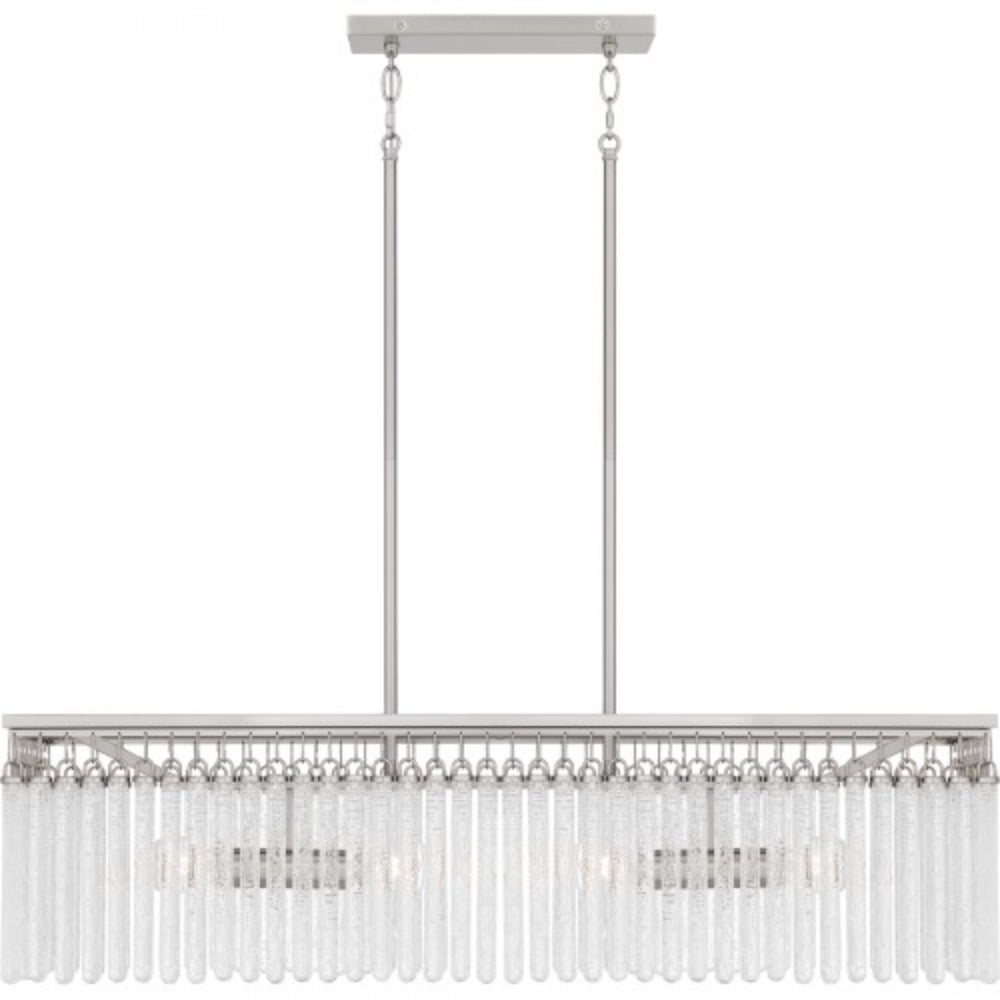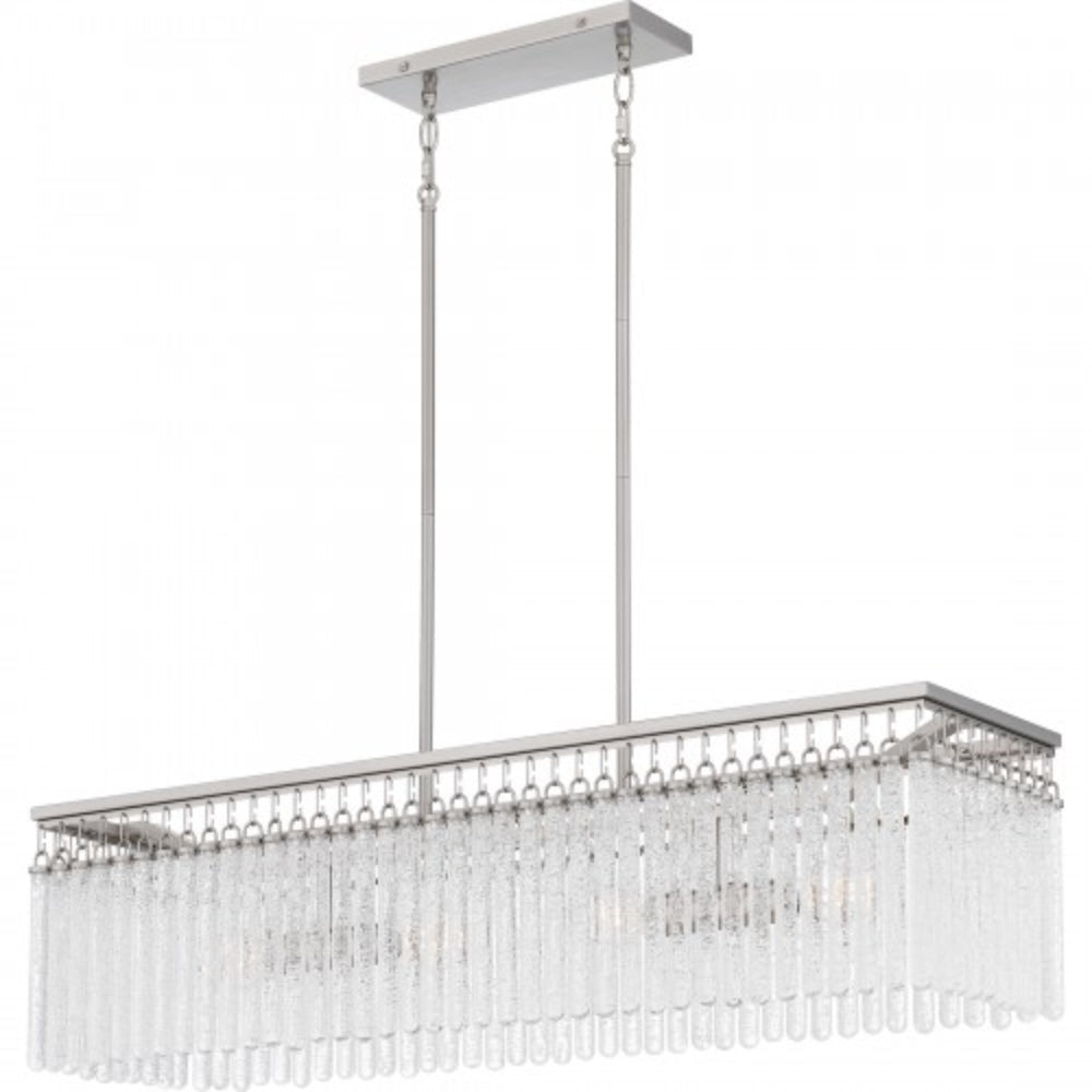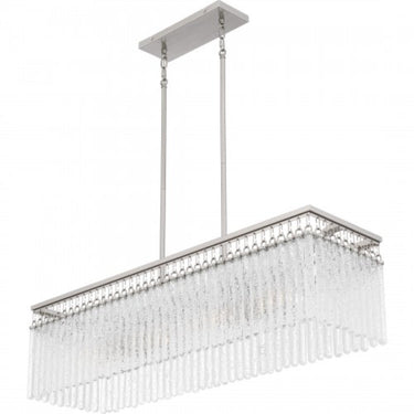 Make a beautiful statement with the Camilla linear chandelier. Clear crystal glass columns hang delicately from the elongated frame, creating a sense of luxury and airiness. Finished in a timeless brushed nickel, this glamorous island light is a timeless centerpiece over any kitchen or dining room table.