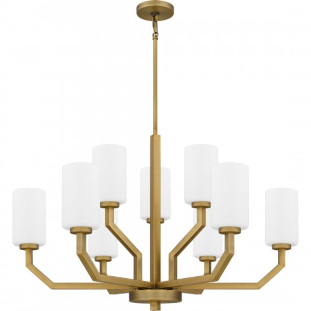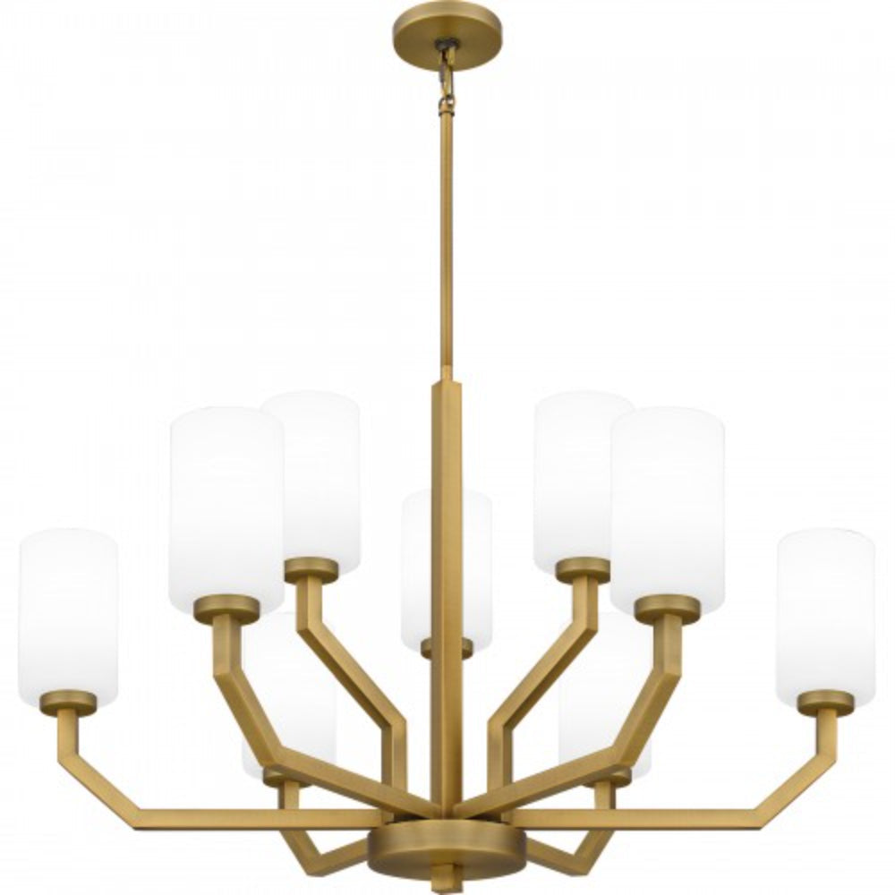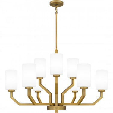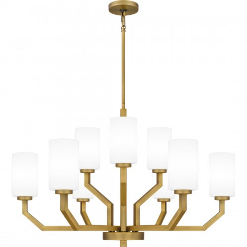 Modern art meets functional lighting in Cavalier. Soft opal glass shades rest atop sculptural, slightly bending arms for a geometric yet sophisticated feel. The aged brass finish adds a beautiful luster, making the Cavalier chandelier a perfect statement piece in any kitchen, living room, or home office.