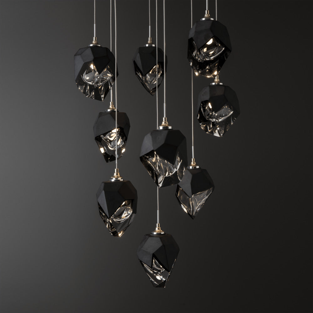 The Chrysalis 9-Light Small Crystal Pendant is the perfect focal piece for a stairwell or other central or corner space where cascading crystals lit from within create a waterfall of light when pendants are staggered. Highly-customizable, each individual crystal light is suspended via low-voltage cable from its round canopy. A thick, clear layer of glass is encased in an outer cocoon of hand-blown, colored glass (matte black or white; all 9 are same color). The lower portion of the outer layer of glass is removed by hand-polishing it, revealing the inner clear layer below.