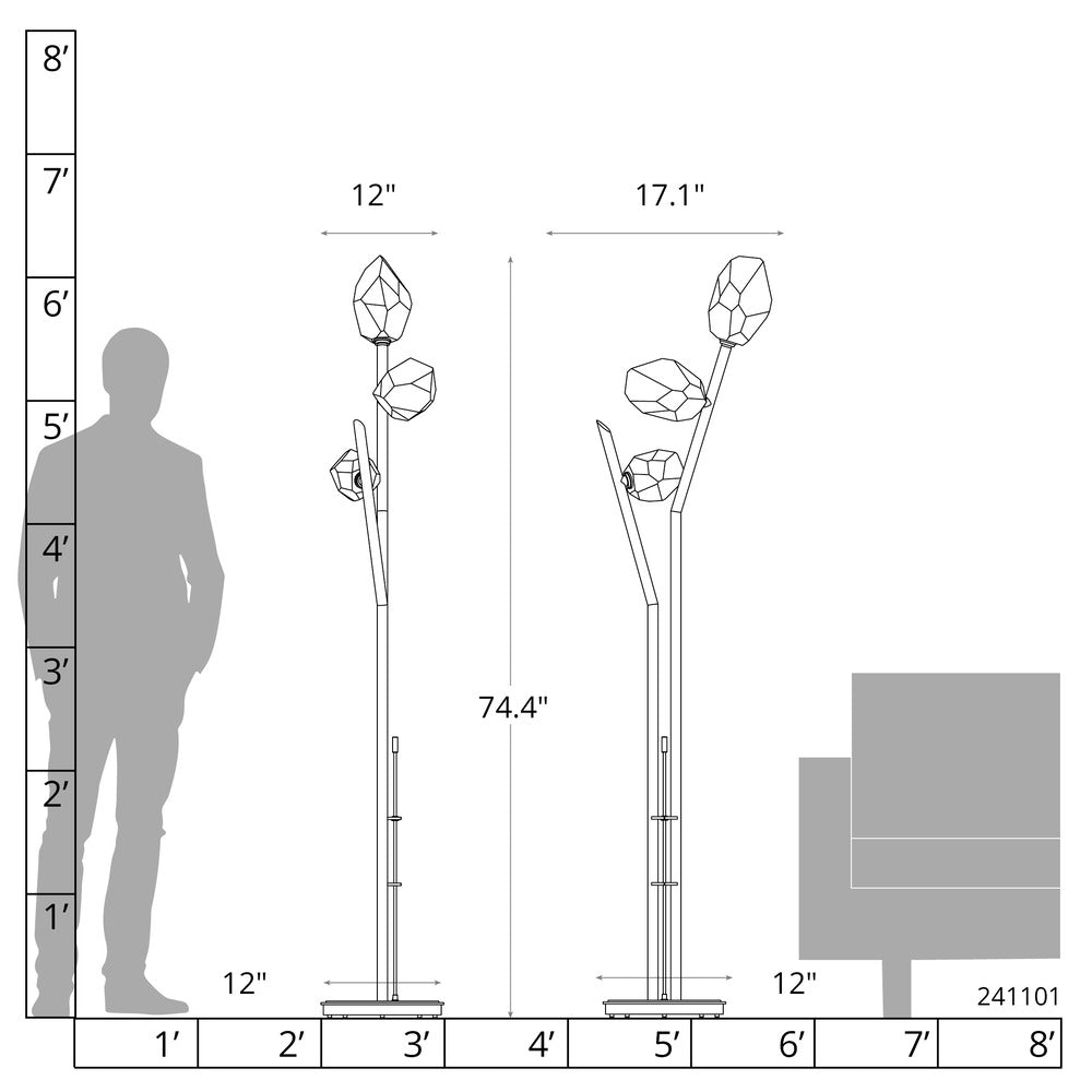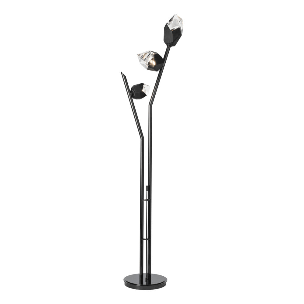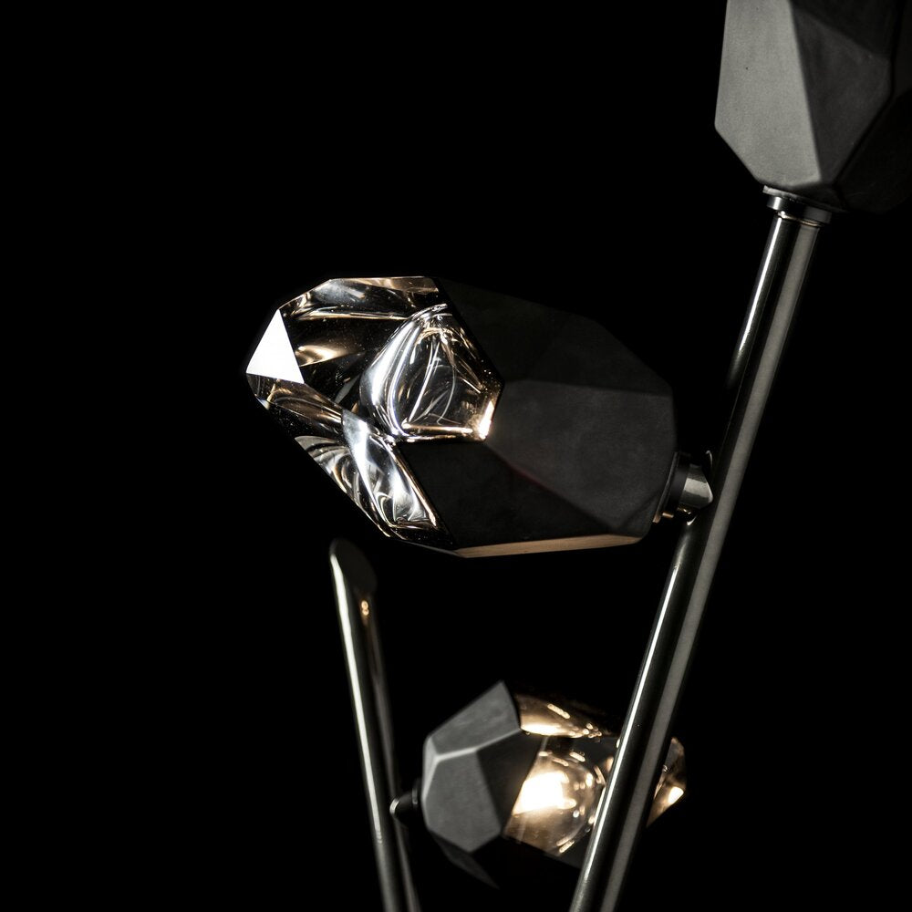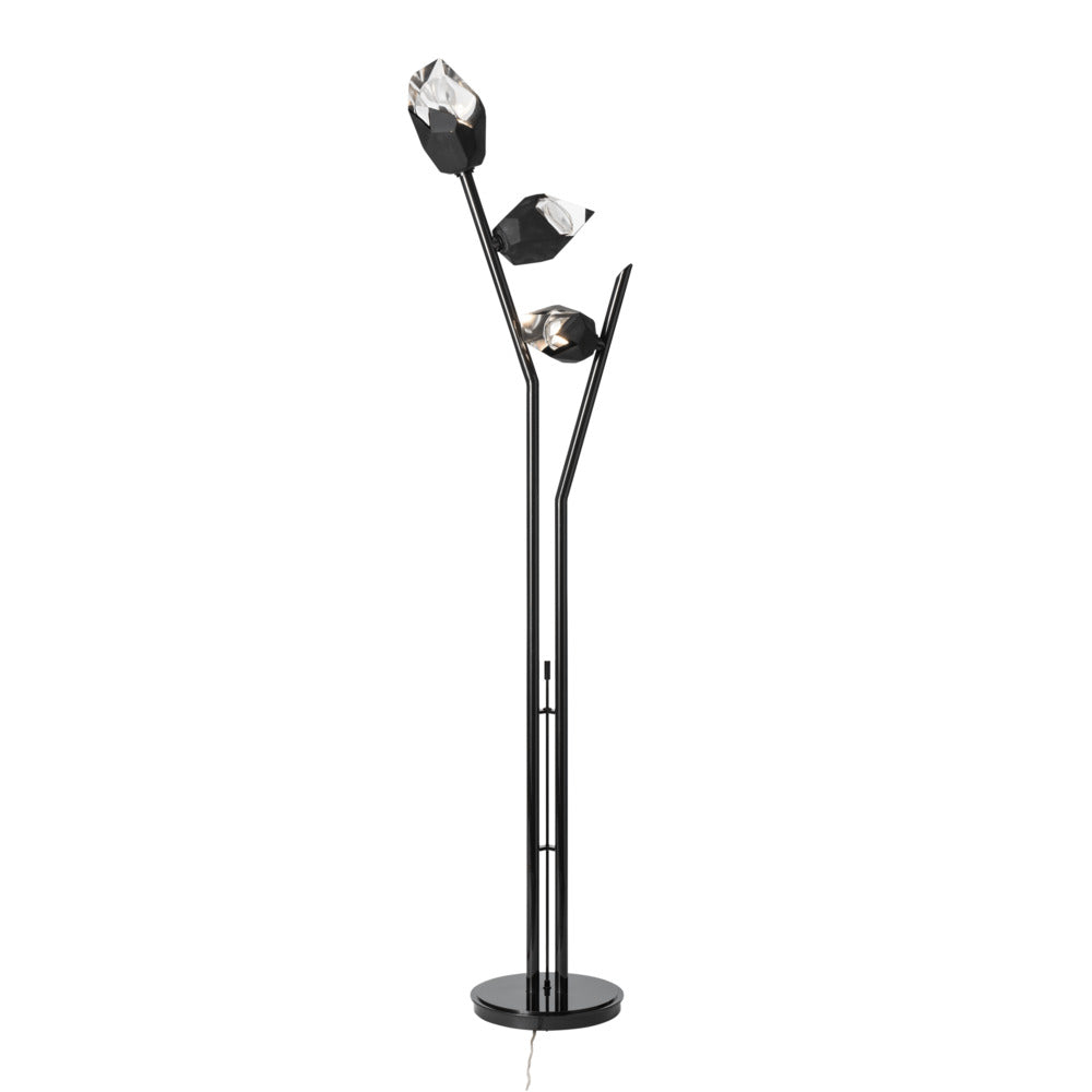 Each Chrysalis Torchiere features three exquisite blown glass pieces, created using intricate glass-blowing techniques. Thick layers of glass are carefully blown into a mold, forming the initial shape. Then, with precision and finesse, a portion of the outer layer of colored glass (matte black or matte white) is removed through an artful grinding and polishing of the facets, revealing the hidden inner sparkle of the clear glass of his sculptural floor lamp.