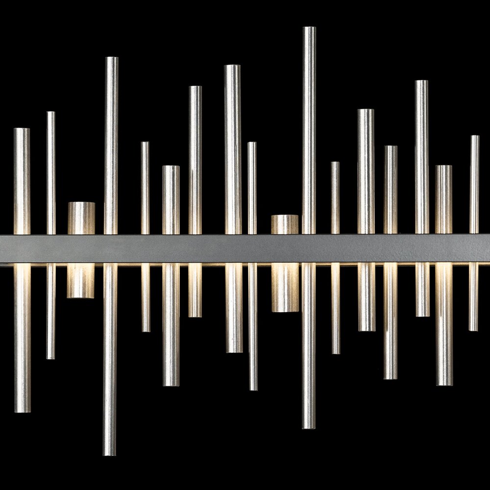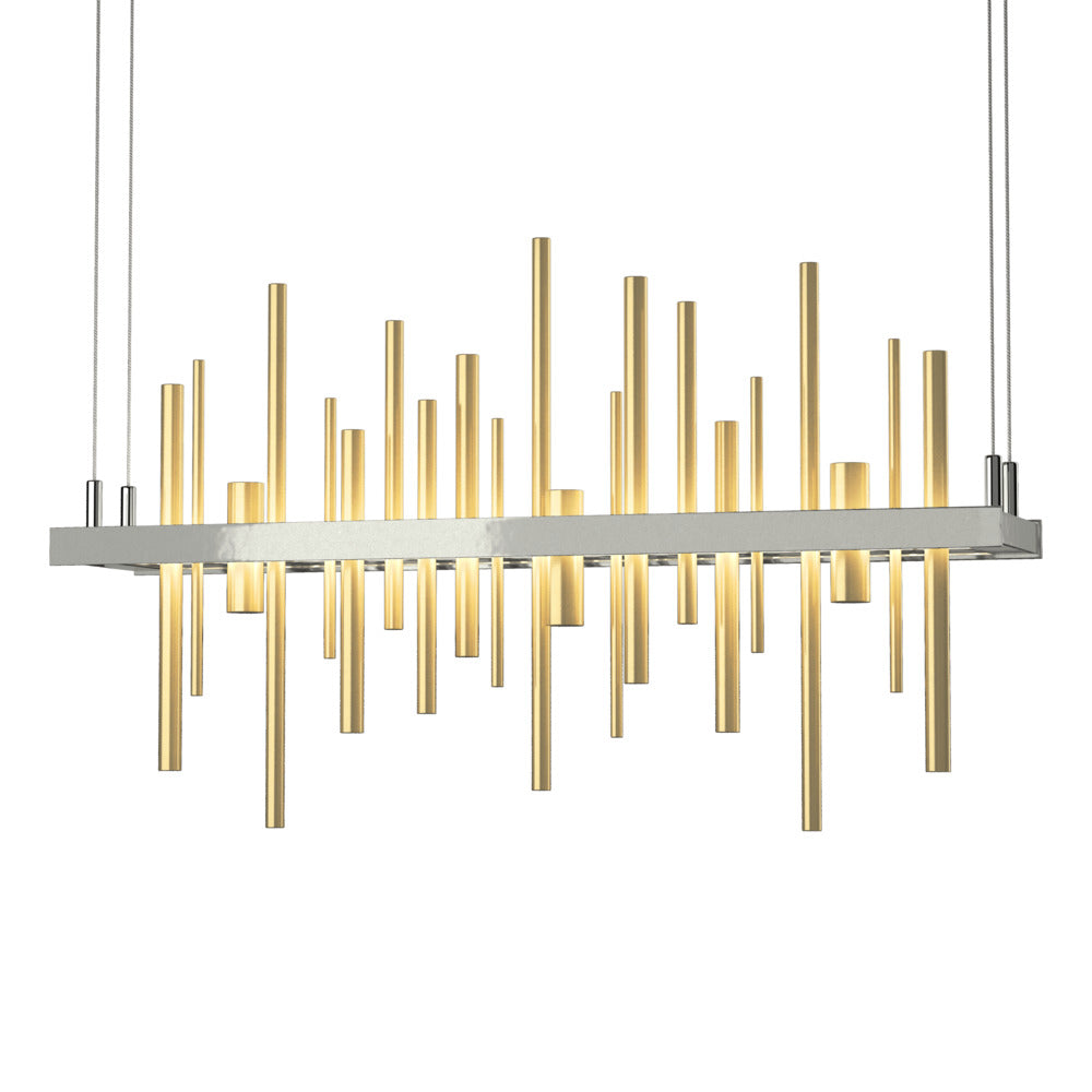 With a choice of accents, this pendant offers an amazing "city view" no matter where you live. Our handcrafted Cityscape seems to be floating in mid-air. The visual concept is meant to evoke the image of skyscraper silhouettes situated on the waterfront (an LED platform) and reflected off the water below. A wash of beautiful up-and-down light graces this elegant fixture.