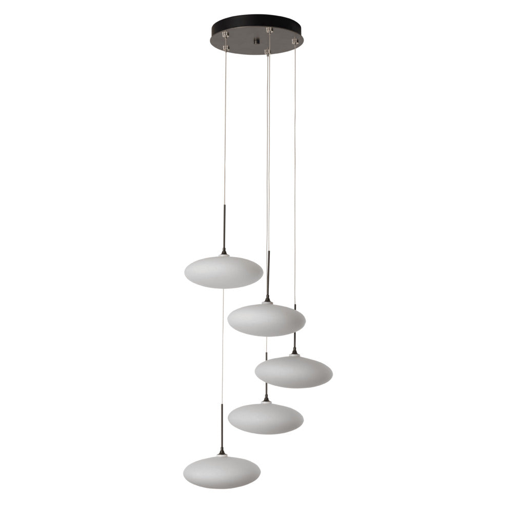 Large white tortoiseshell-like glass "puffs" inspired this collection's name, Clouds. The ability to customize the lengths of each cable makes it possible for this versatile Clouds 5-Light fixture to serve as a semi-flush with shortened cables, or as a pendant with staggered individual lights, descending from a round canopy.