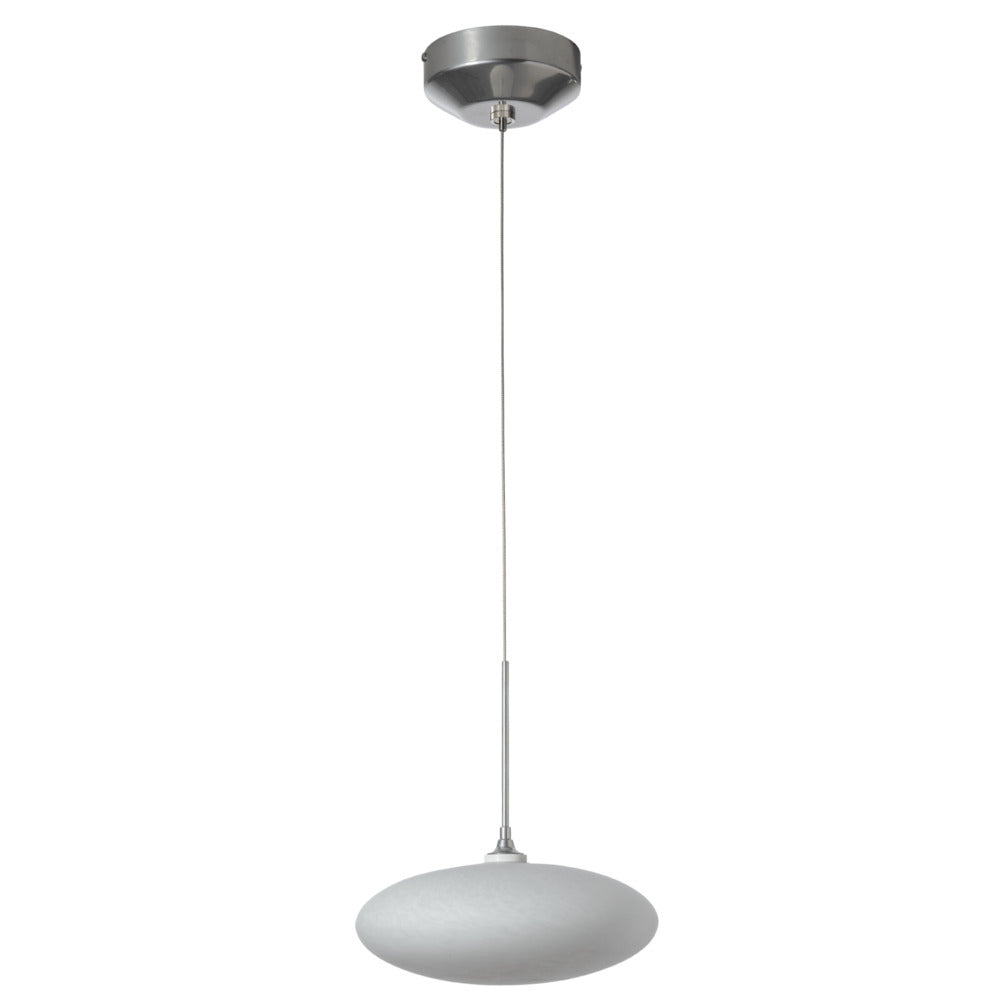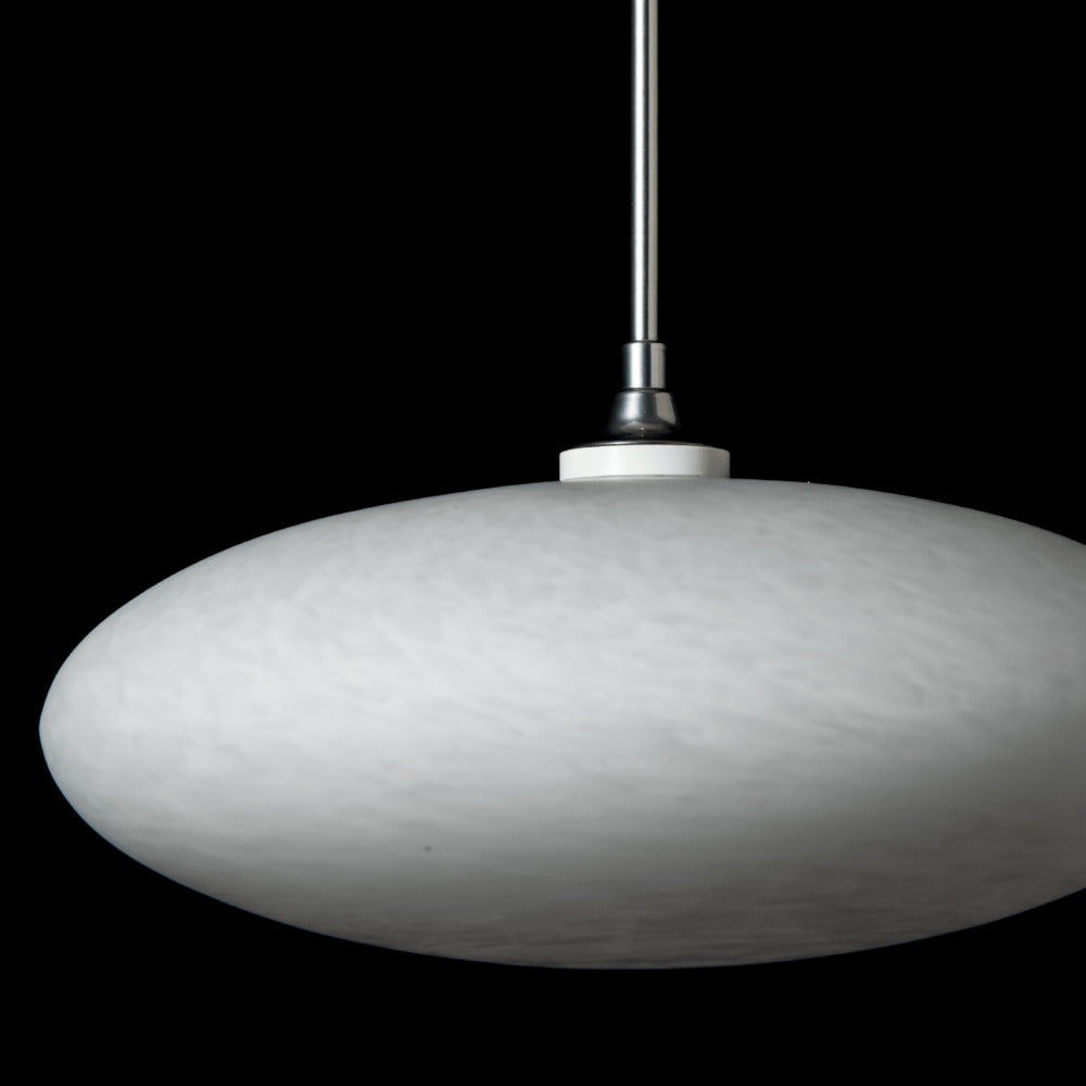 A large squoze sphere that looks to have been pressed on top and bottom to form its unique and delicate shape. Like the puff of a cloud (some also see a UFO) the Cloud is suspended on a low voltage cable. It's white tortoise shell-like glass glows from the light within.