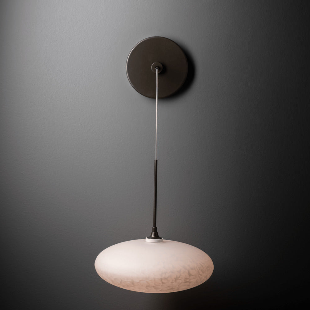 Fall asleep dreaming of clouds with this puffy white drop-sconce by your bedside. The Clouds Low Voltage Sconce can be set your own desired drop height for unique applications, including beside or vanity, among others. The white tortoise shell-like glass, lit from within, glows in this uniquely shaped, highly-adjustable, low voltage cabled wall sconce.