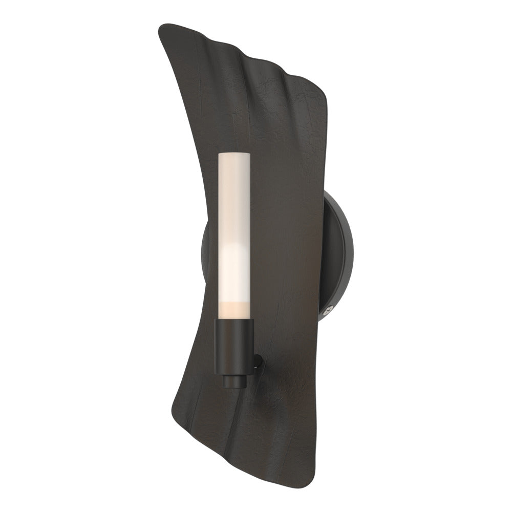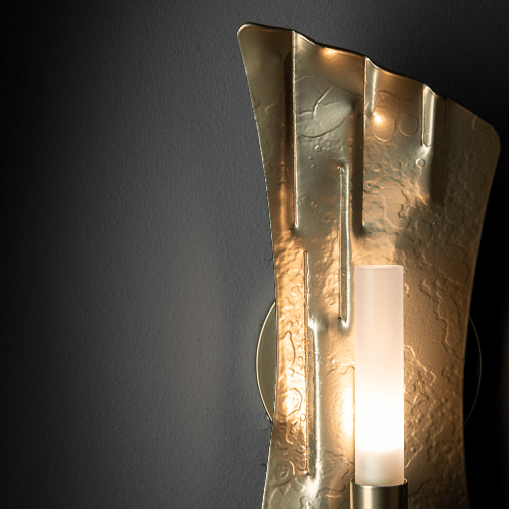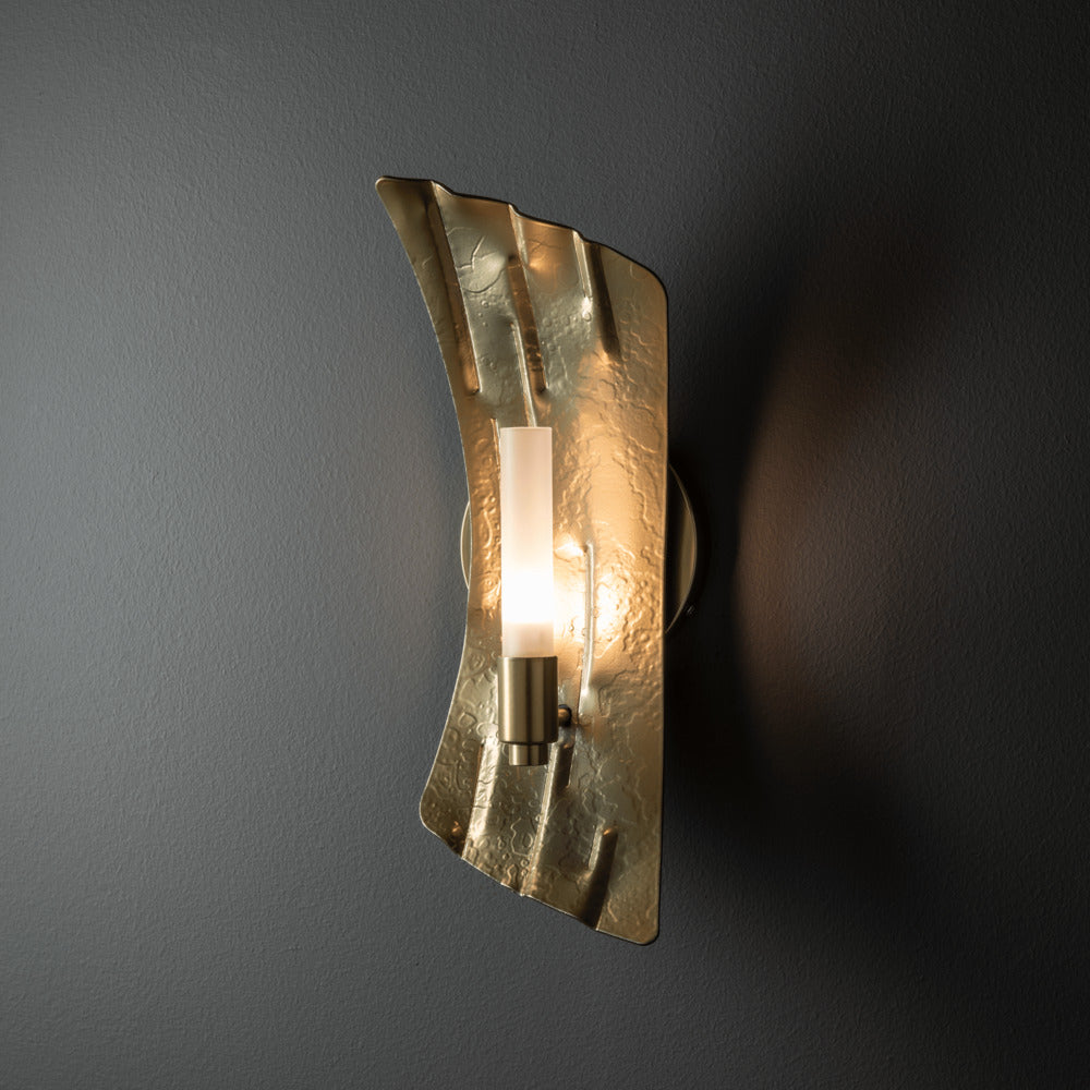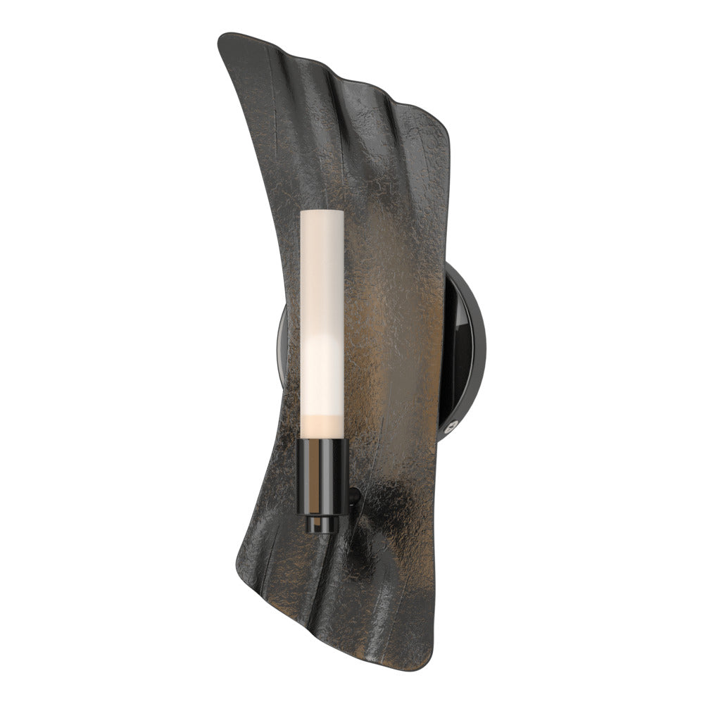 Designed by Jason Hancock who took inspiration from its namesake "crest" of ocean waves, the Crest 1-Light Sconce features a beautifully textured and curved backplate, whose handcrafted, hammered steel pattern is put on display when lit.