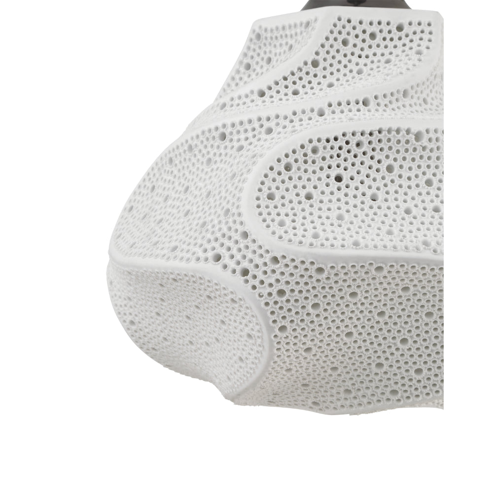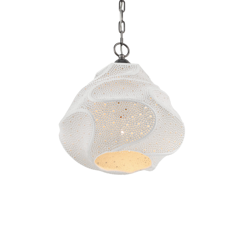 The Wintershall White Pendant features an organically shaped porcelain shade with a flowing, sculptural surface. After firing, each piece is meticulously hand-drilled with two sizes of openings, creating a subtle, rhythmic pattern that requires exceptional precision to execute. This dimmable, single-light pendant showcases the skill of the artisans behind it. Adjustable from 21.75" to 89.75" with use of included chain/rod kit/cable. If your space calls for a longer drop, additional chain/rods/cable is available for purchase.