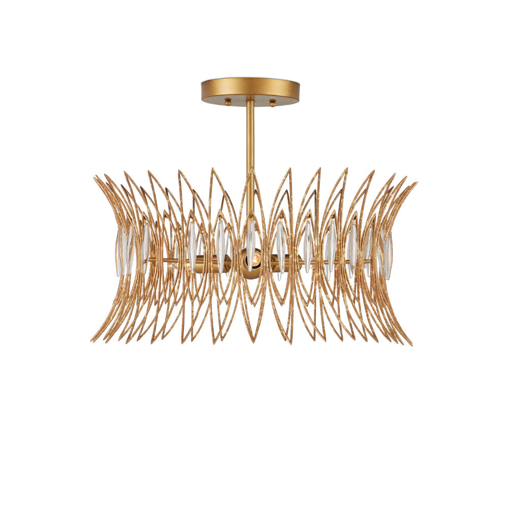 The Marquise Semi-Flush Mount is crafted from slender wrought iron wires in a Luxor gold finish, giving the surface a subtly speckled texture. Inspired by mid-century jewelry design, the crown-like frame holds abstract leaf motifs, each of which is adorned with an oblong piece of clear glass that catches and diffuses the light from the three bulbs within.