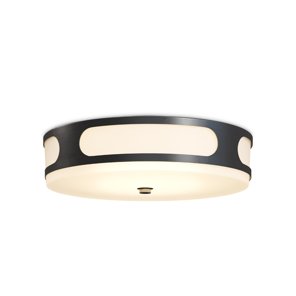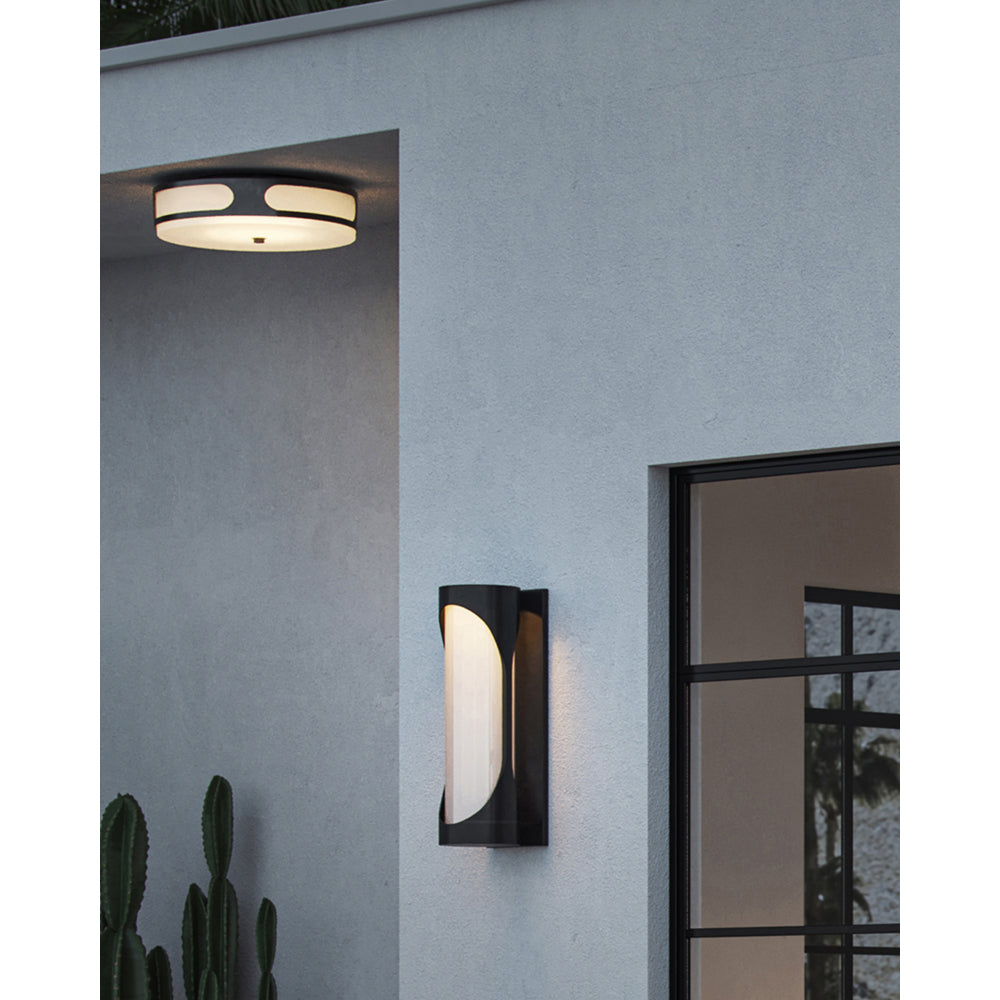The Swale Outdoor Flush Mount has a graphic silhouette with cut outs where illumination can escape. The sides of the black flush mount are covered with a milky white glass that illuminates uniformly when the integrated LEDs shine through it. The metal is powdercoated to make this outdoor flush mount weather-worthy.