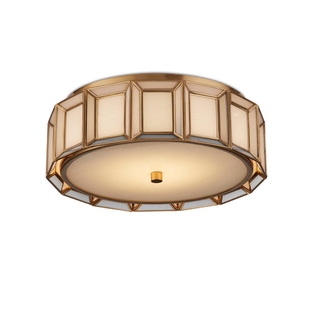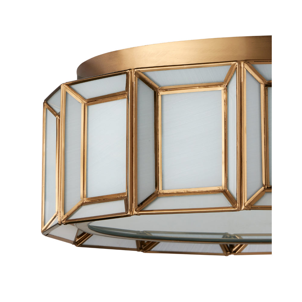 When a soft glow is desired, milk glass is one of the best materials to diffuse illumination. The Daze Flush Mount is made of articulated panels of white milk glass that are joined together by ribs of metal in an antique brass finish. This white flush mount will turn luminous and glow beautifully through the painted glass diffuser at the bottom when it is switched on.