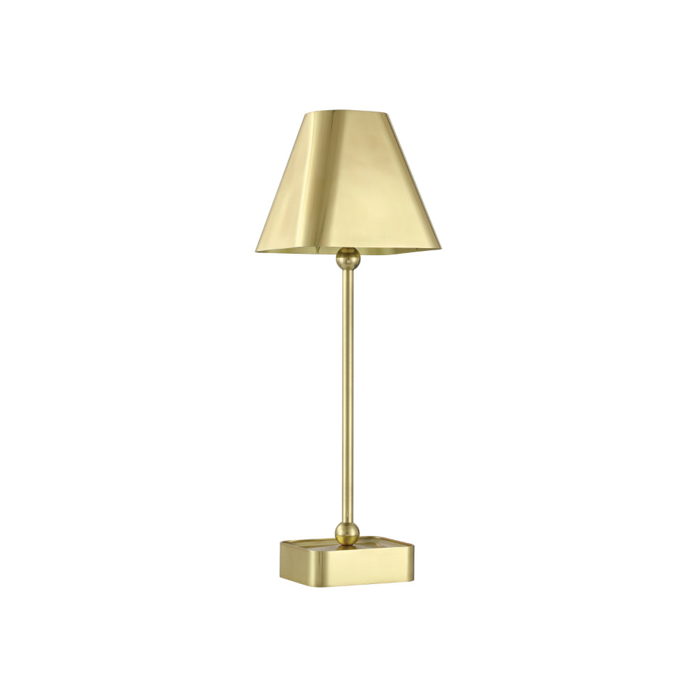 The Gadabout Brass Cordless Table Lamp is a gold lamp that gets around given its freedom to move. The rechargeable bulb sits atop the metal body in a brass finish, and the matching metal shade slides seamlessly over it. The on/off switch is on the top of the bulb, and the shade is finished on the inside for a luxe touch.
