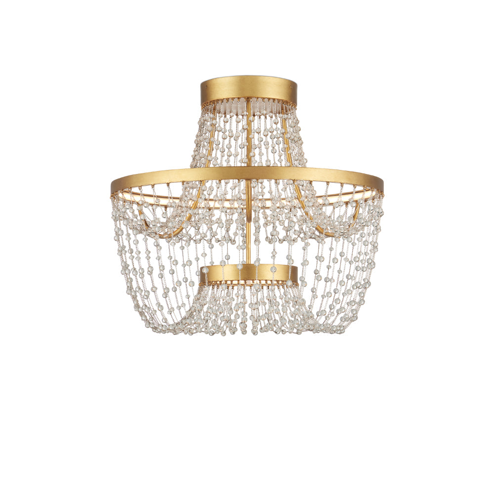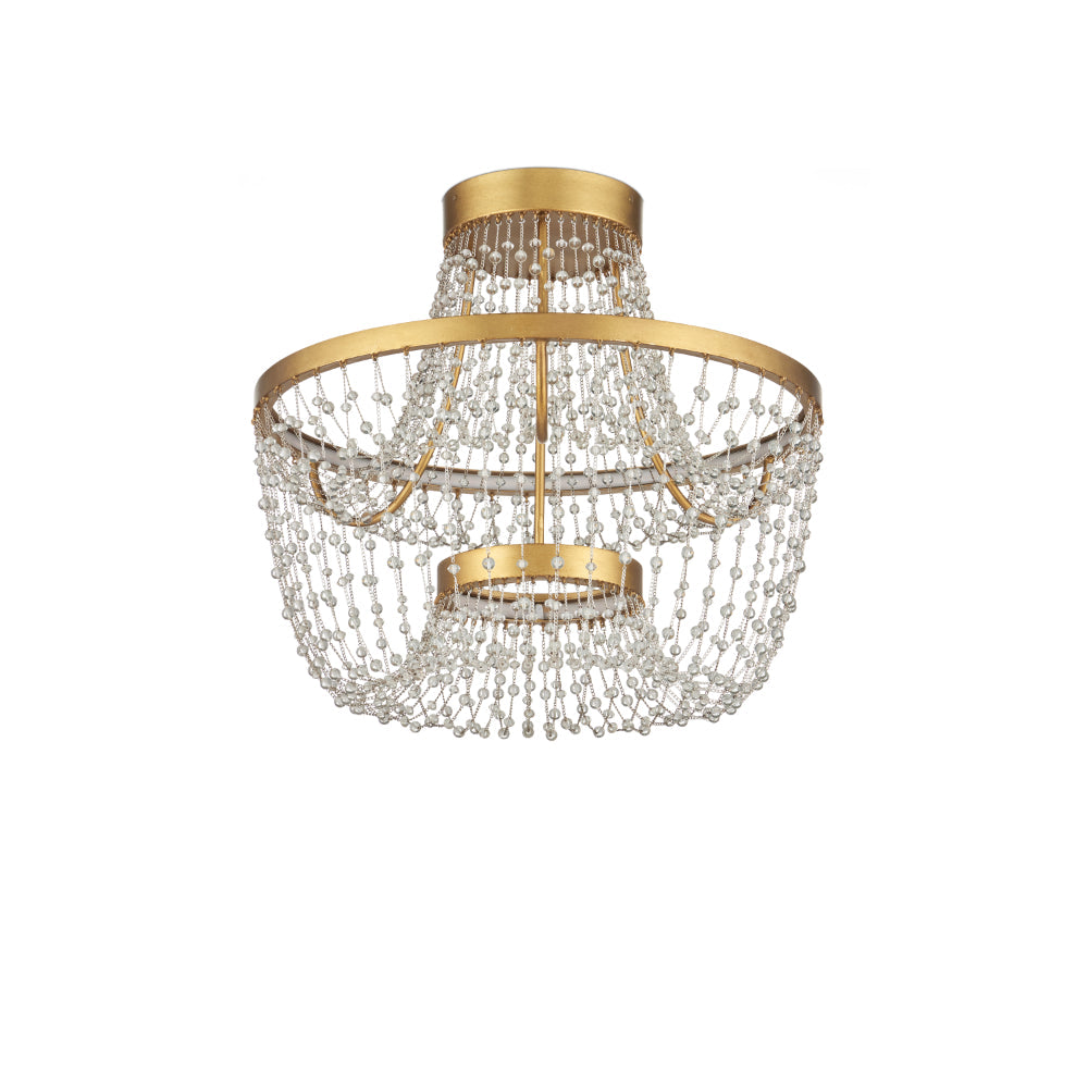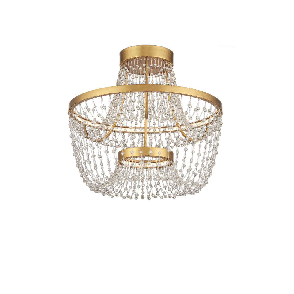 The Mademoiselle Flush Mount features flowing swags of glass beads suspended from wrought iron bands in a contemporary gold leaf finish. Two sizes of beads are strung in a loose, free-form arrangement, giving the piece an open, sculptural quality. Integrated LED strips are hidden behind the metal rings, casting an even, ambient glow that enhances both the shimmer of the beads and the warmth of the gold.
