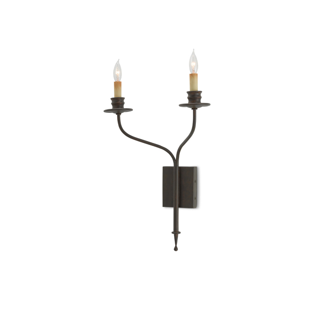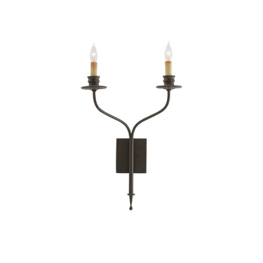 The elegant wrought iron frame of the Highlight Wall Sconce, in a bronze gold finish, curves upward in a lovely, slender arc. Extending below the wall plate, the frame comes to a sophisticated nib. The black sconce, which is shaped like a delicate divining rod, can be fitted with shades.
