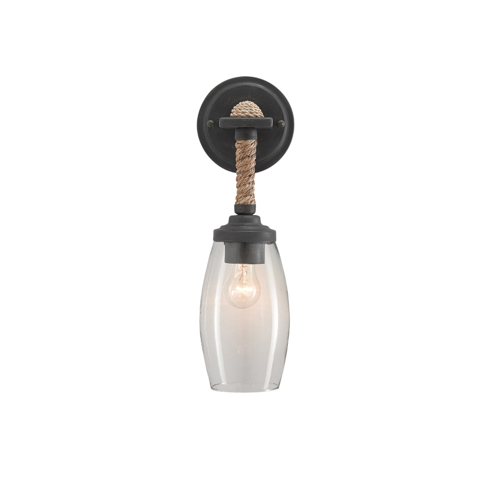 The perfect combination of natural and industrial materials, the Hightider Wall Sconce has a recycled glass shade and a wrought iron frame in a French black finish. The Abaca rope that is wrapped around the neck of the nautical sconce brings it a hint of texture.