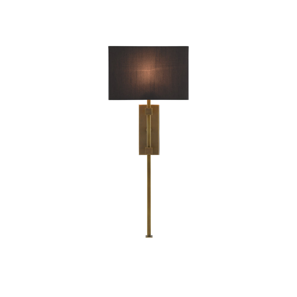 Our Edmund Wall Sconce is made up of an interplay of angular forms. It is the careful placement of each of these that creates a sophisticated profile: the thin vertical stem that extends far beyond the wall plate, in an antique brass finish, and the equally clean-lined black shantung shade set atop them horizontally.