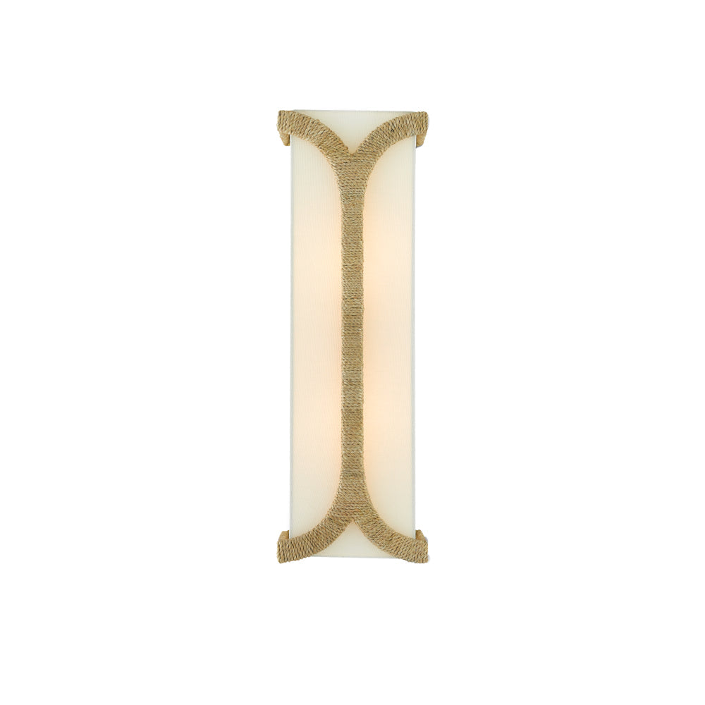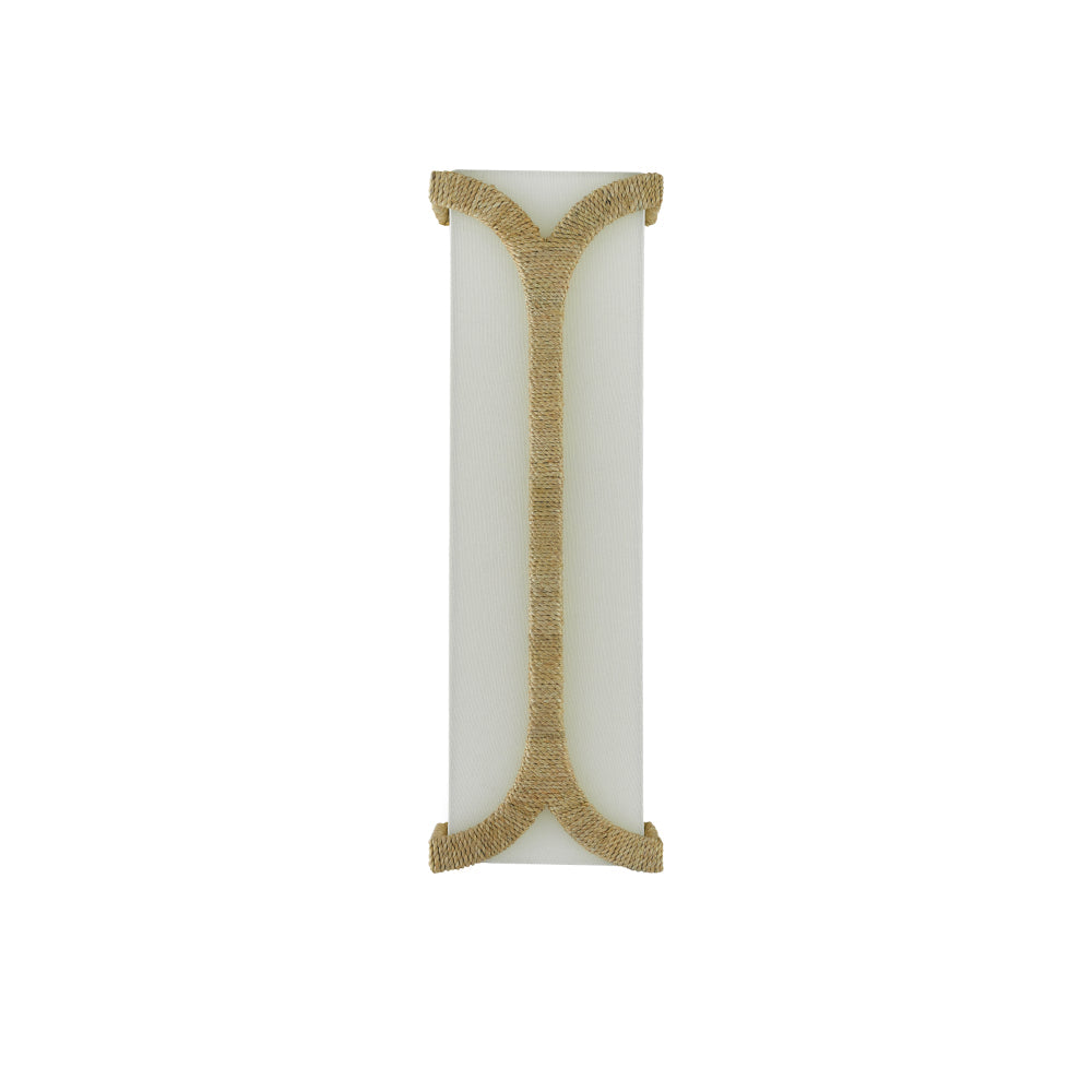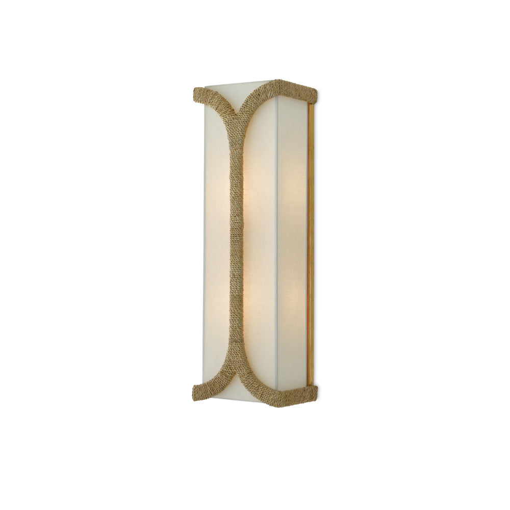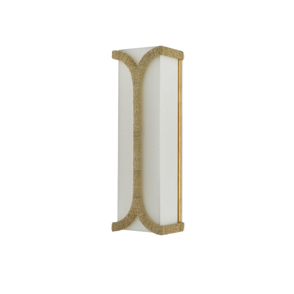 The Carthay Wall Sconce has a curving motif wrapped in Abaca rope that embraces the eggshell linen shade. A design note is how cleverly it arcs from the top of the backplate to affix the shade to the wrought iron frame in a dark contemporary gold leaf finish.