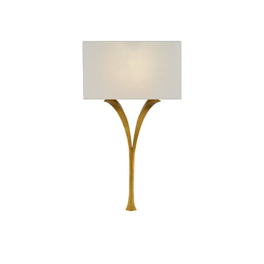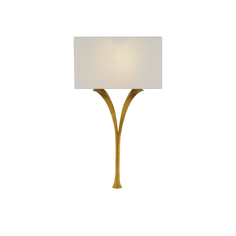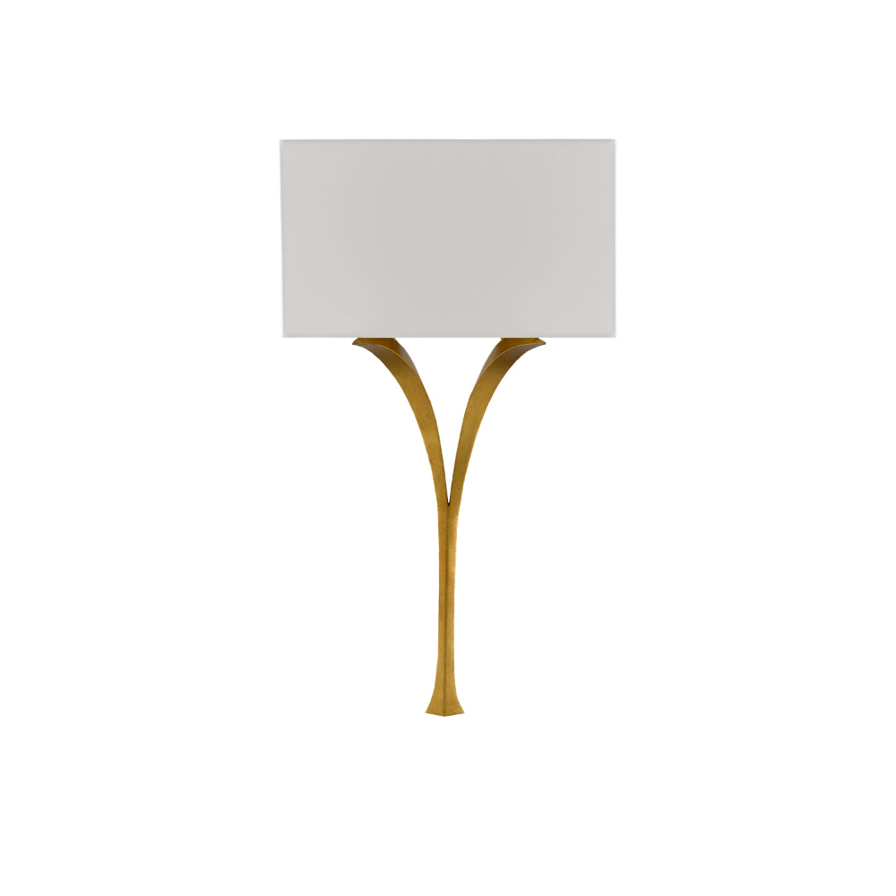 The delicately beautiful Choisy Wall Sconce is made of wrought iron in an antique gold leaf finish. The winsome curve of the wishbone shape and the slight flare at the bottom bring this gold sconce gracefulness. The sconce is fitted with a rectangular white linen shade.