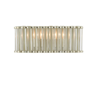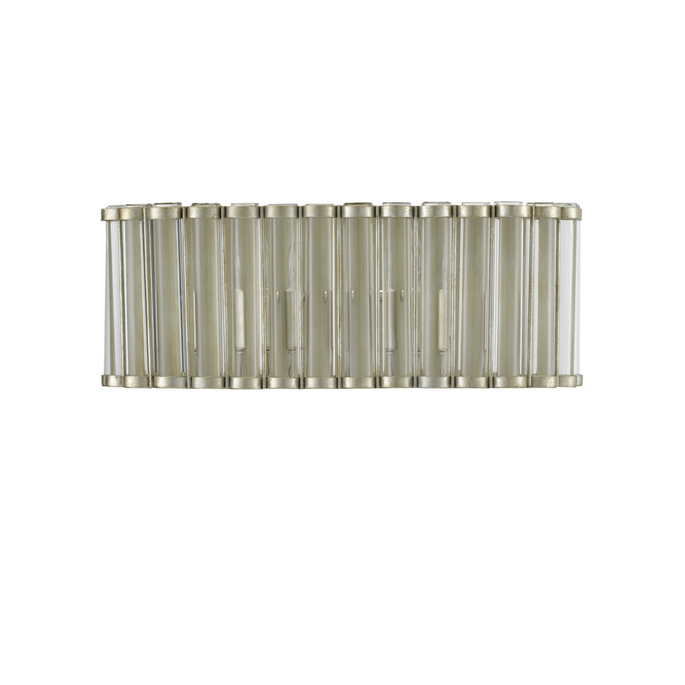 Bunny Williams has achieved a timeless profile with the Warwick Wall Sconce that diffuses light through high-grade optic crystal tubes. Ribbons of wrought iron in a contemporary silver leaf finish hold the canisters of illumination in place so that the curved form is barely discernable from the front. This silver wall sconce is certified for damp locations.