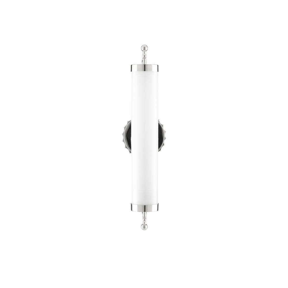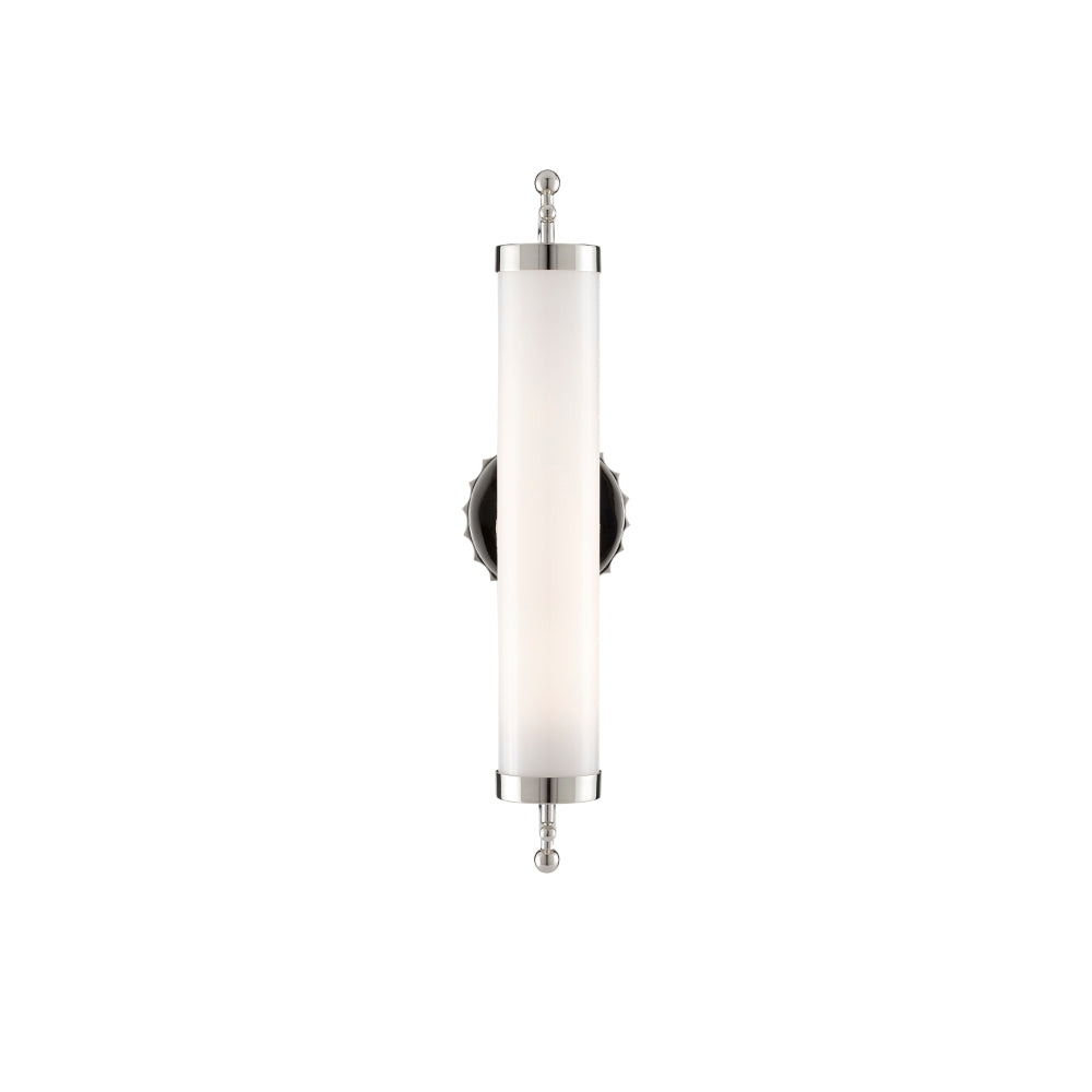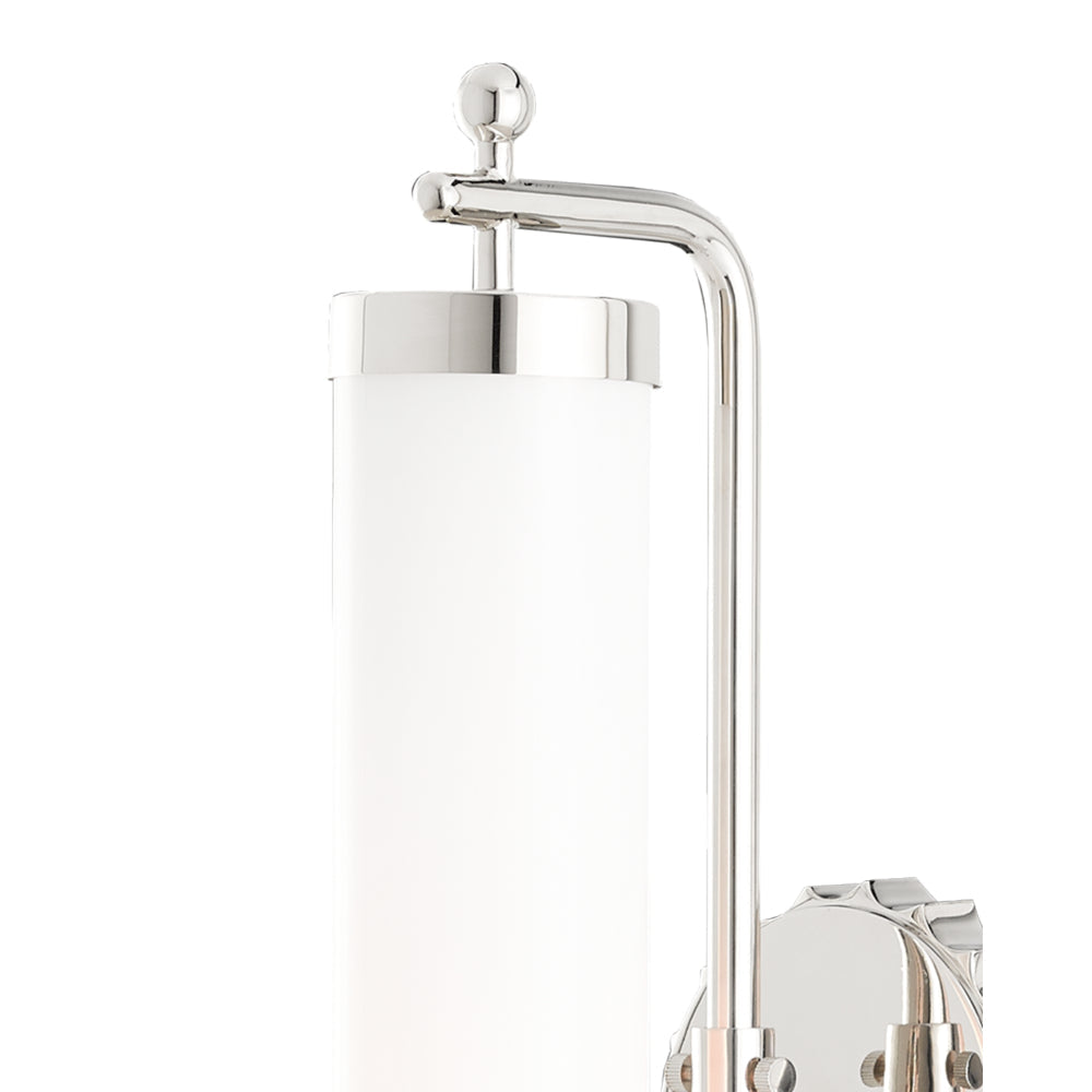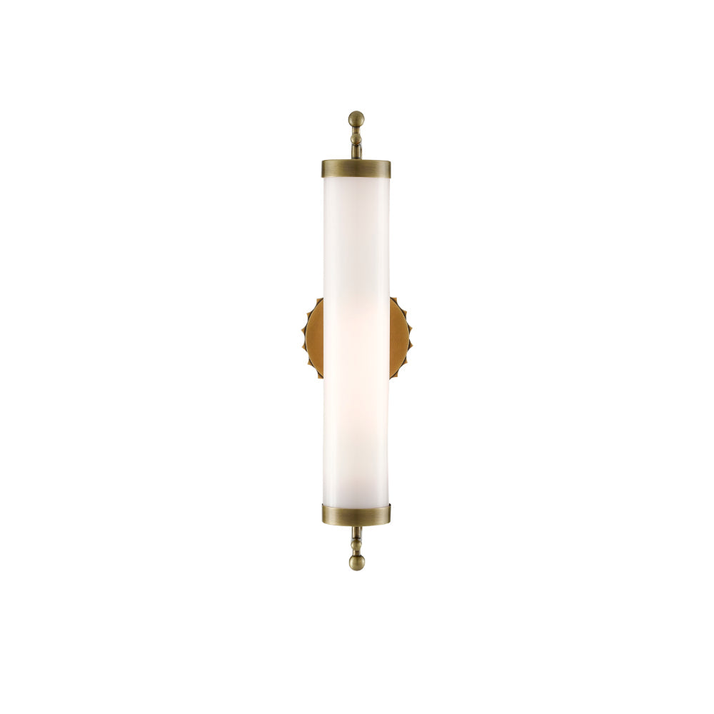 The Latimer Brass Wall Sconce in our Barry Goralnick Collection is made of metal in an antique brass finish and a tubular milk-glass shade. This gold sconce is certified for damp locations. We also offer the Latimer in a polished nickel wall sconce and as a pendant.