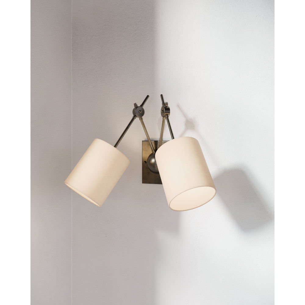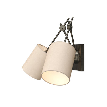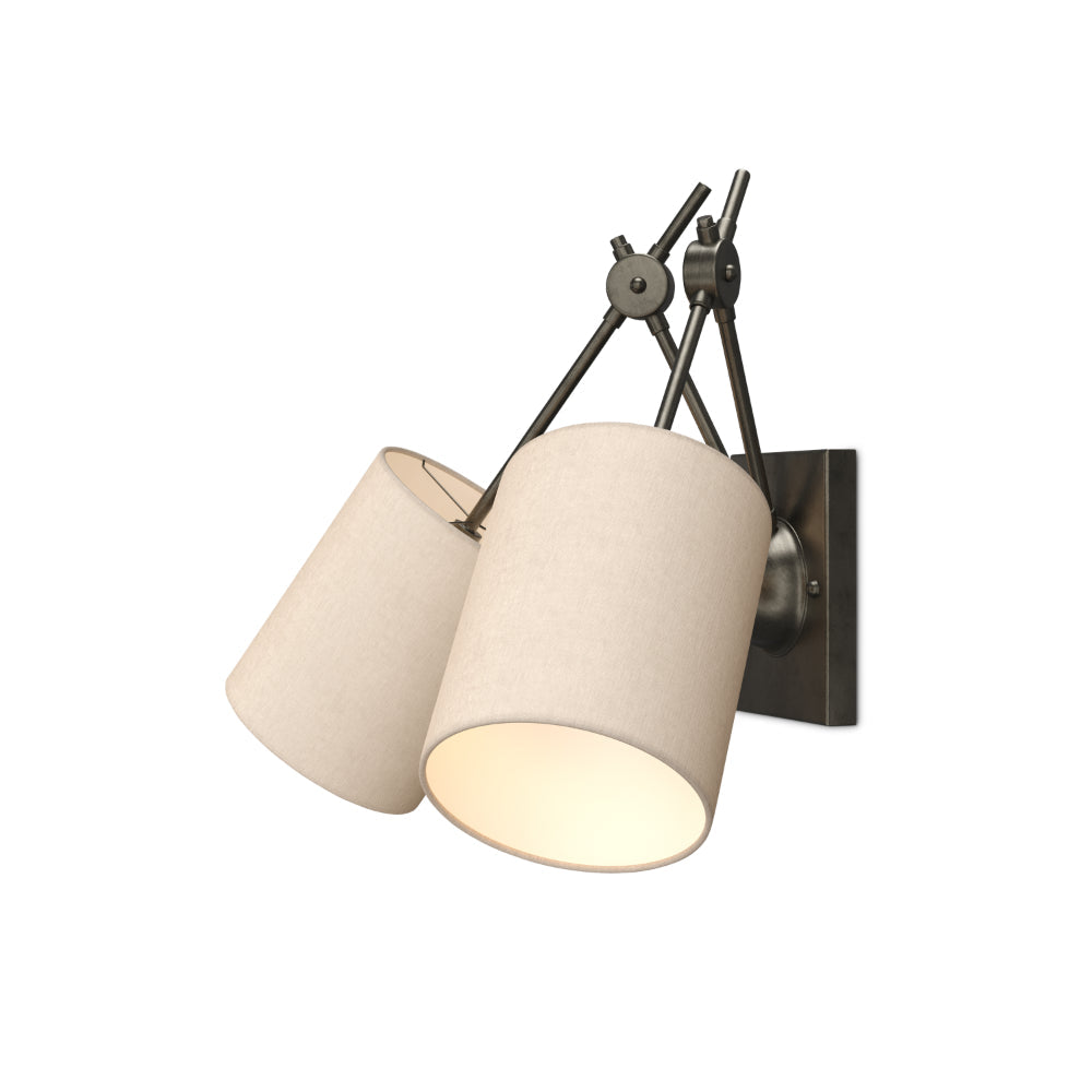 The angular arms and black Iron finish on the Compass Wall Sconce hold references popular during the Industrial Age. The rings that connect the arms on this black sconce have a machined feel to them, appearing as if they could raise the two white linen shades that angle away from each other.