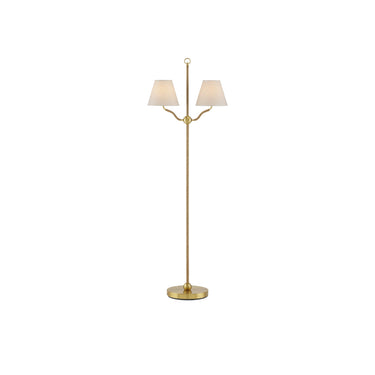 The Sirocco Floor Lamp features a light profile, with all but the main decorative elements wrapped in jute rope. These include the ring at its apex, the small globes at its base and the one connecting the forked arms, and the base itself. Made of steel and natural plated antique brass, the rope floor lamp is fitted with two off-white linen shades. This is a petite floor lamp designed to be a decorative accent in a space.