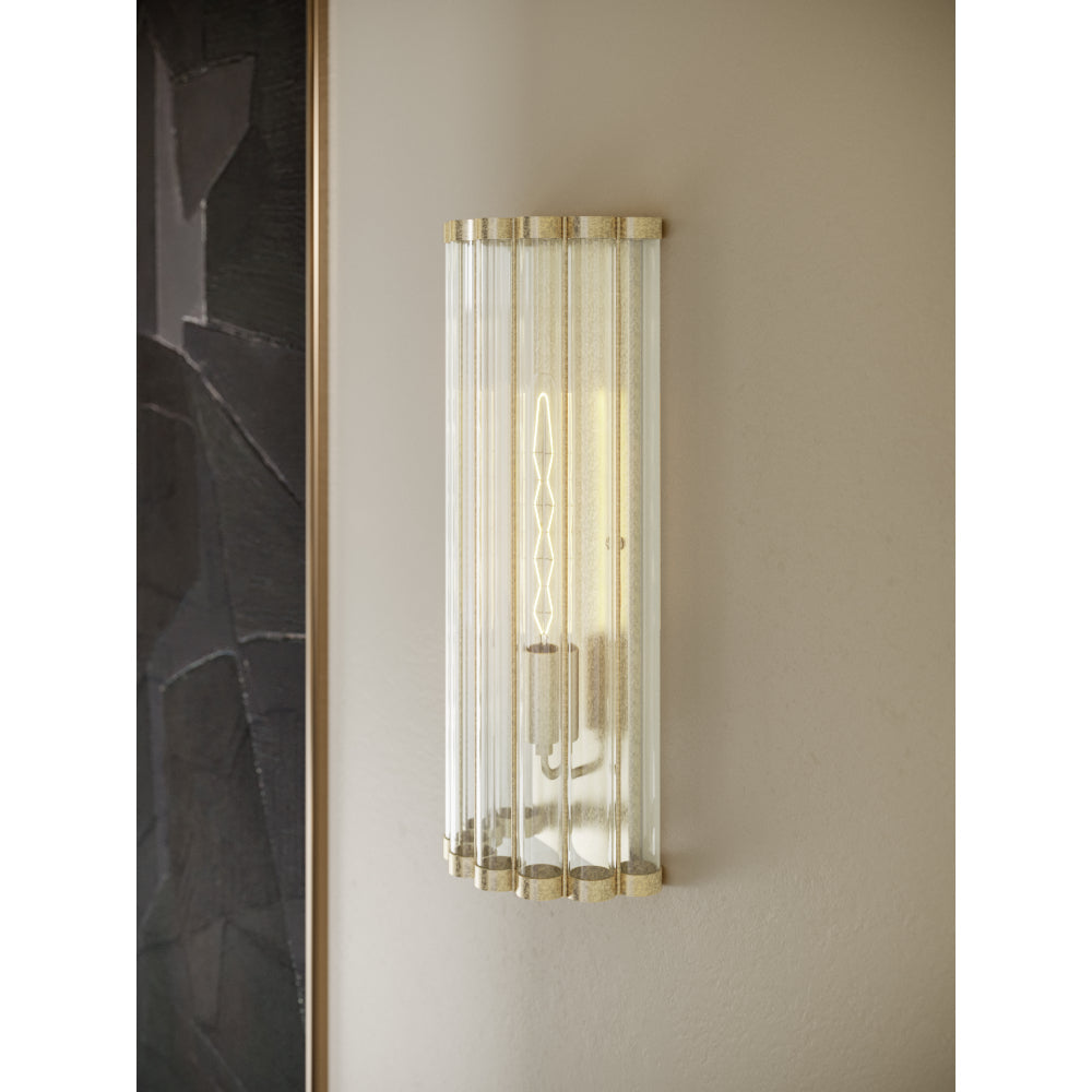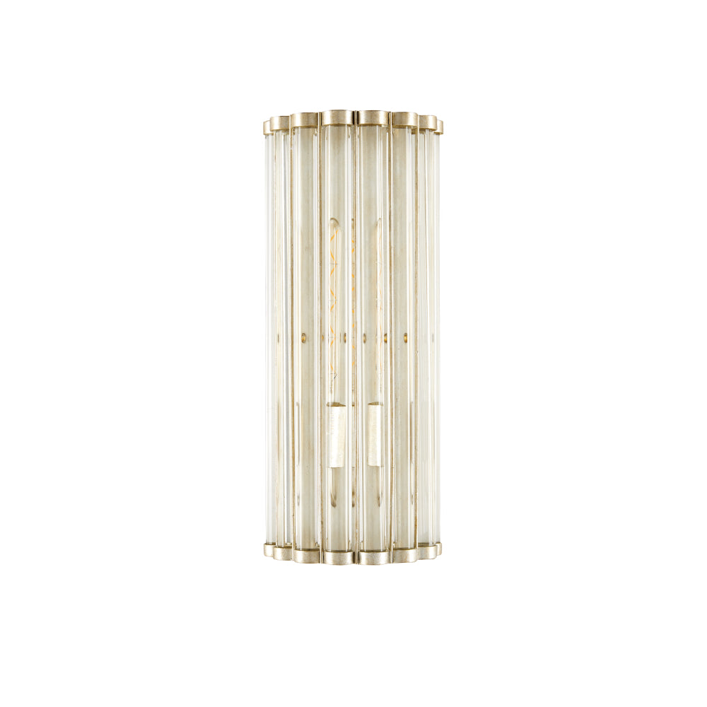 Bunny Williams has achieved a timeless profile with the Warwick Tall Wall Sconce that diffuses light through high-grade optic crystal tubes. Ribbons of wrought iron in a contemporary silver leaf finish hold the cylinders of illumination in place so that the curved form is barely discernable from the front. This clear glass wall sconce is ADA compliant.