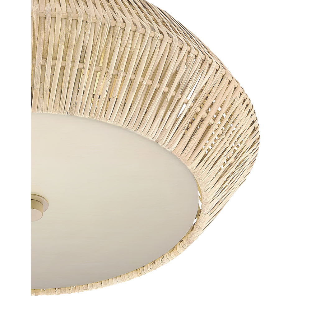 The Antibes White Flush Mount is crafted from natural bleached rattan that flows along the exterior of the fixture, the interior wrought iron frame finished in snow white to complement the pale natural material. The two lights are filtered by an acrylic diffuser to make it idea for small spaces.