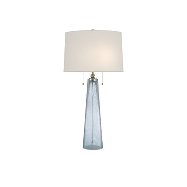 Pale blue seeded glass makes our Looke Table Lamp luminous. The material has been blown into a tall, slim column that telescopes downward. Metal hardware and pull-chains are in a brass finish, and the slender pale blue table lamp is topped with an off-white shantung drum shade.