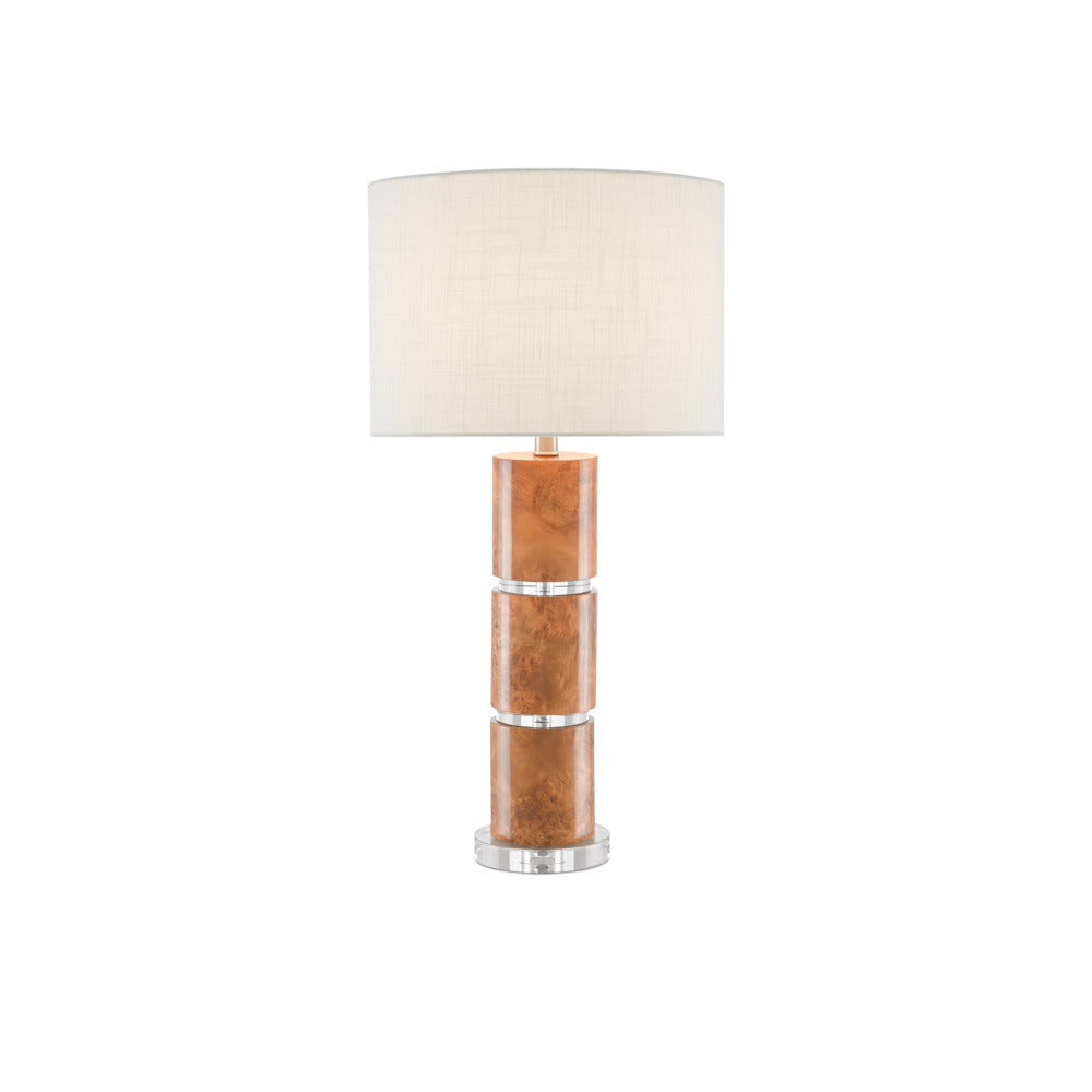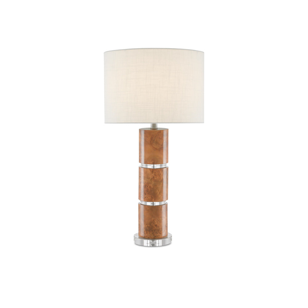 The cylinders on the Birdseye Table Lamp are sheethed in a marbled paper that mimicks the patterns in birdseye maple. Separated by optic crystal discs that match the optic crystal base, these are warm-toned elements on the wood-toned table lamp that are contrasted by the sheen of the crystal and the white shantung shade.