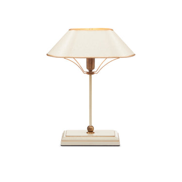 The Daphne Table Lamp looks as if it is made of one material in three distinctive finishes but the base is made of wood while the other elements on the ivory table lamp are made of wrought iron and brass in antique brass and gold finishes. The shape of the oval shade with its painted trim is a design detail worth noting.