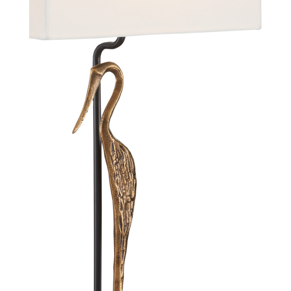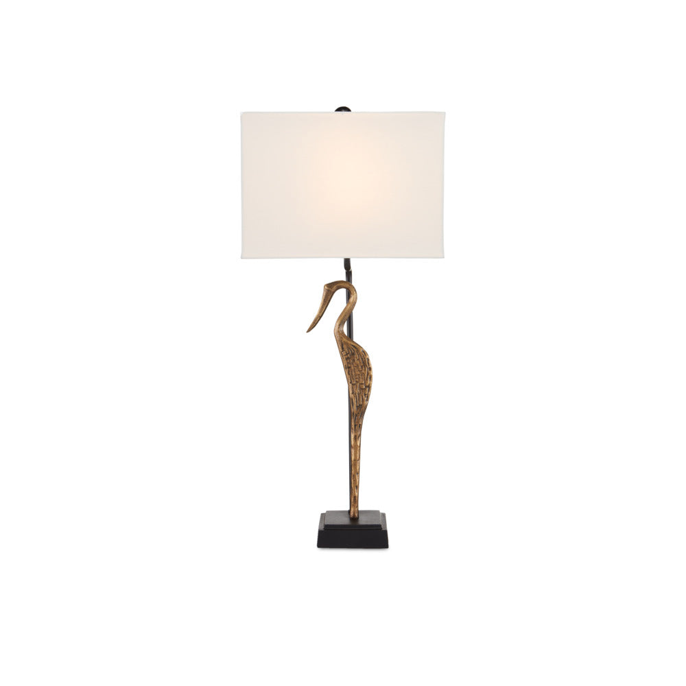 Looking as serene as a contemplative Greek princess from antiquity, the abstracted profile of the wading bird on the Antigone Table Lamp makes it a perfect choice for adding a bit of whimsy to a room. Made of cast aluminum in a mix of antique brass and black finishes, the svelte, long-billed bird is perched atop a black painted, cast aluminum base. The inspiration for this gold table lamp was a sculpture with the same lithe silhouette.