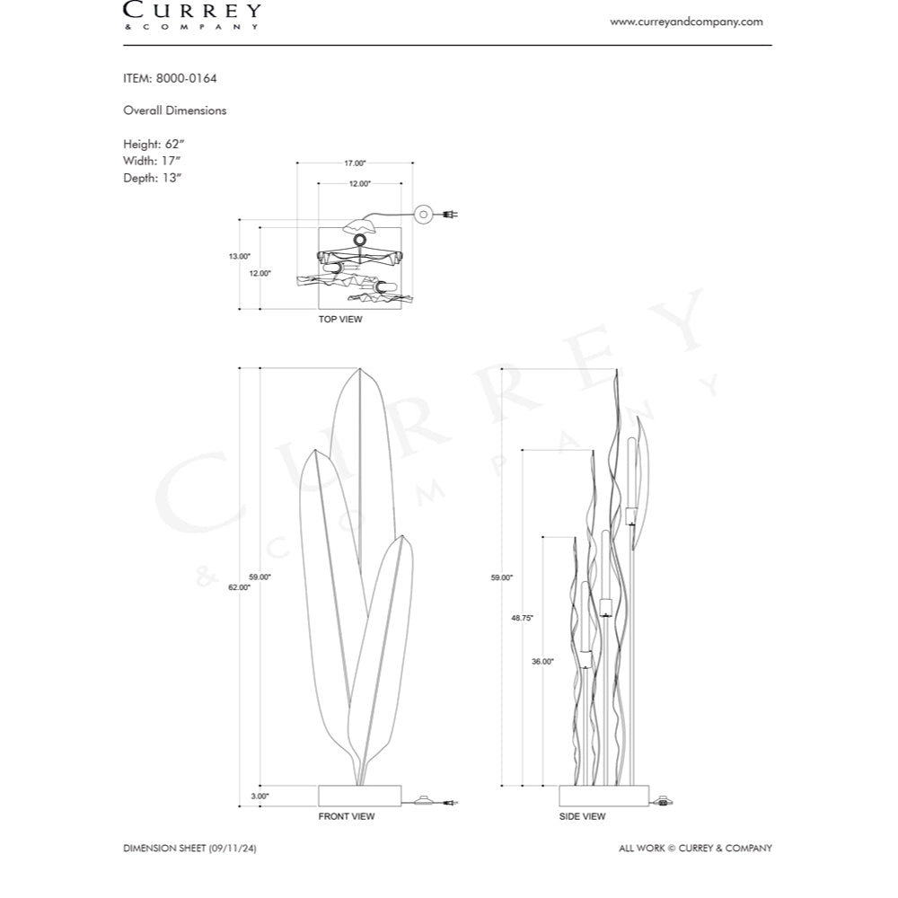 A true work of art, the Musa Floor Lamp is realized through a complex, multi-hour process. The three stylized kelp leaves are undulant as if they are flowing with the movement of the ocean, an organic treatment that is difficult to achieve in metal. These swells, along with the veins and pockmarks that bring the leaves their personality, are hand-hammered by artisans. This gold floor lamp reflects ambient light that makes it an illuminated sculpture rising from a black granite base.