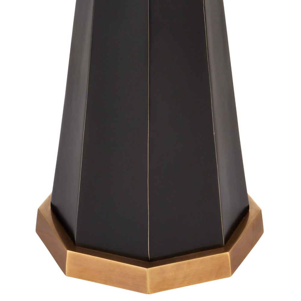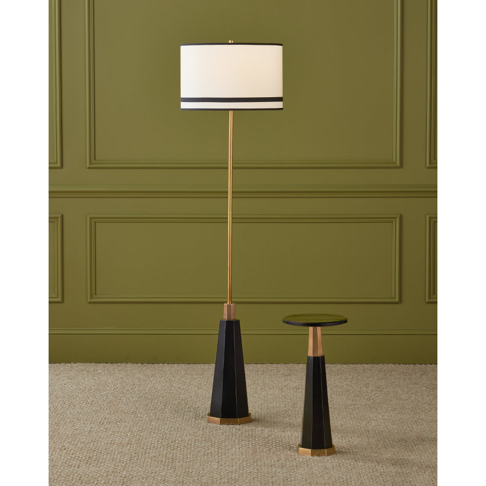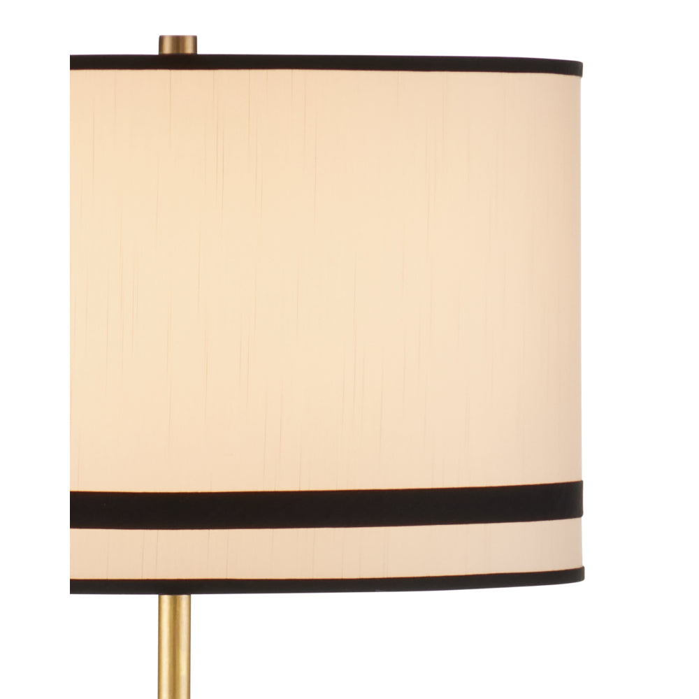The Gieves Floor Lamp is a sophisticated blend of rich materials and timeless design. Its telescoping pedestal crafted from metal in a bronze finish that sits atop a base in an antique brass finish that matches the thin stem that rises toward a black-tie striped shade with black circlets of trim.