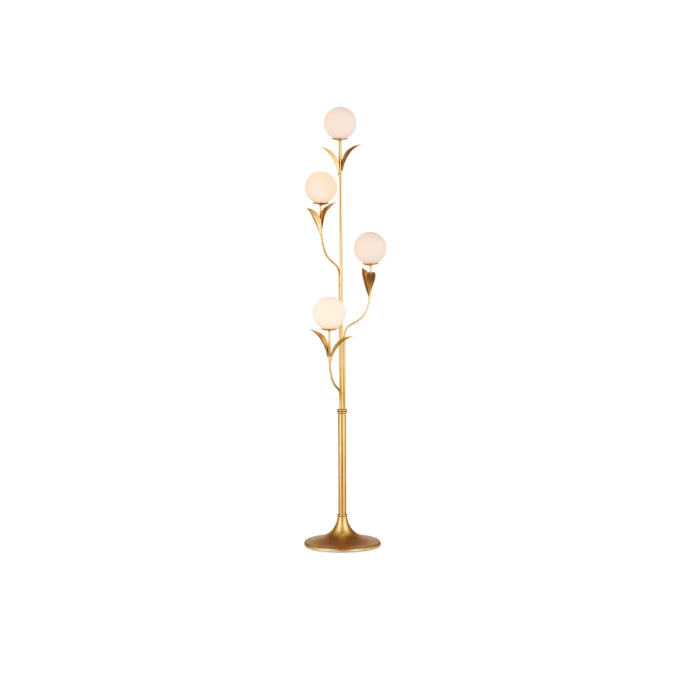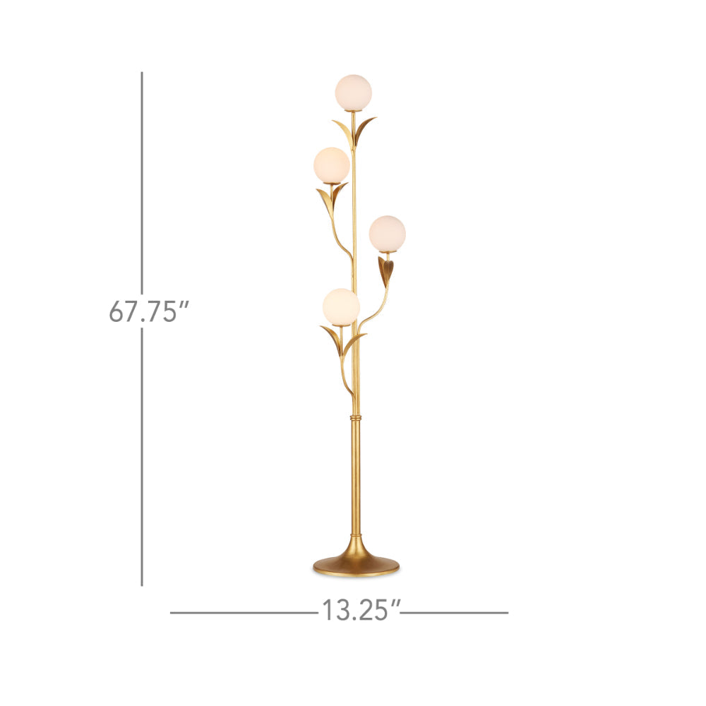 The Rossville Floor Lamp exudes a contemporary retro vibe with its globe-shaped bulbs. This nature-inspired floor lamps is modern in its makeup with the thin arcing leaves that flow along the body and stem of each of the four lights. Made of wrought iron in a contemporary gold leaf finish, the bobeches balance their white glass globes brilliantly.