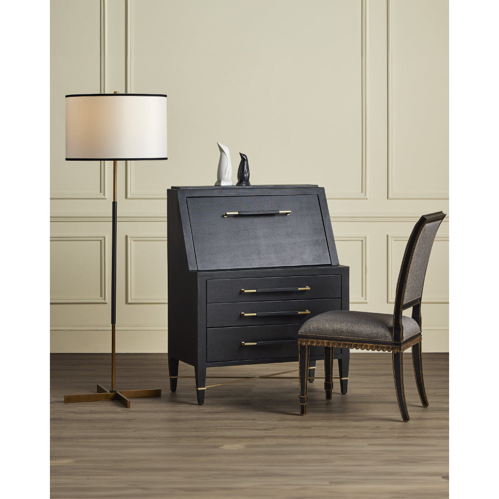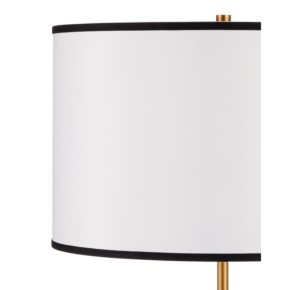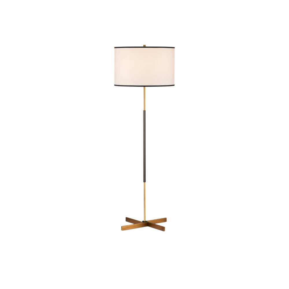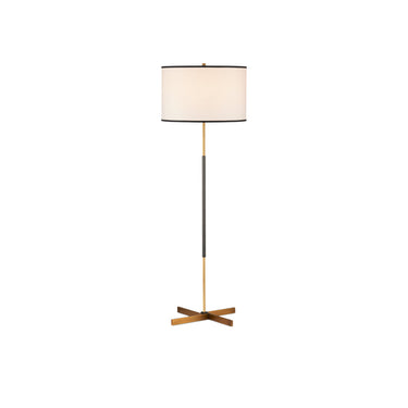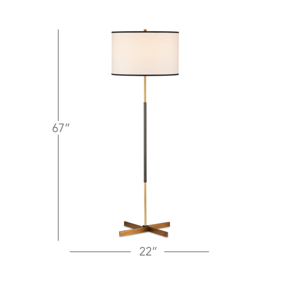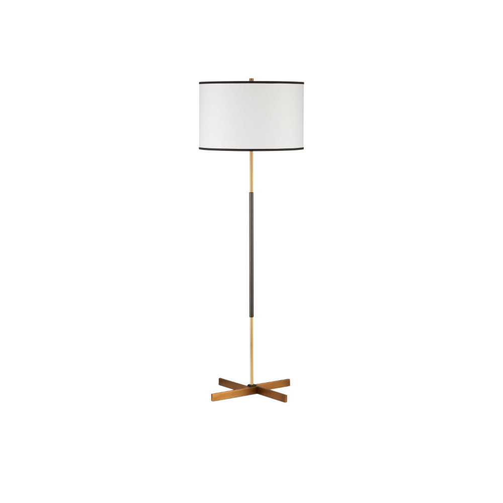 The design of the Willoughby Floor Lamp began with the pinwheel-shaped base. Beginning at the bottom and designing upward, this metal floor lamp features a mix of brass and oil-rubbed bronze finishes. Placing the bronze finish in the middle of the thin stem and choosing an off-white shantung shade with black trim were artful moves that bring this composition cohesion.
