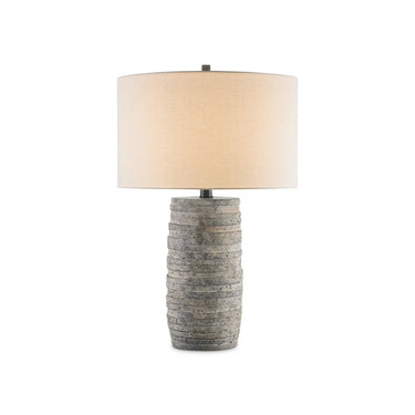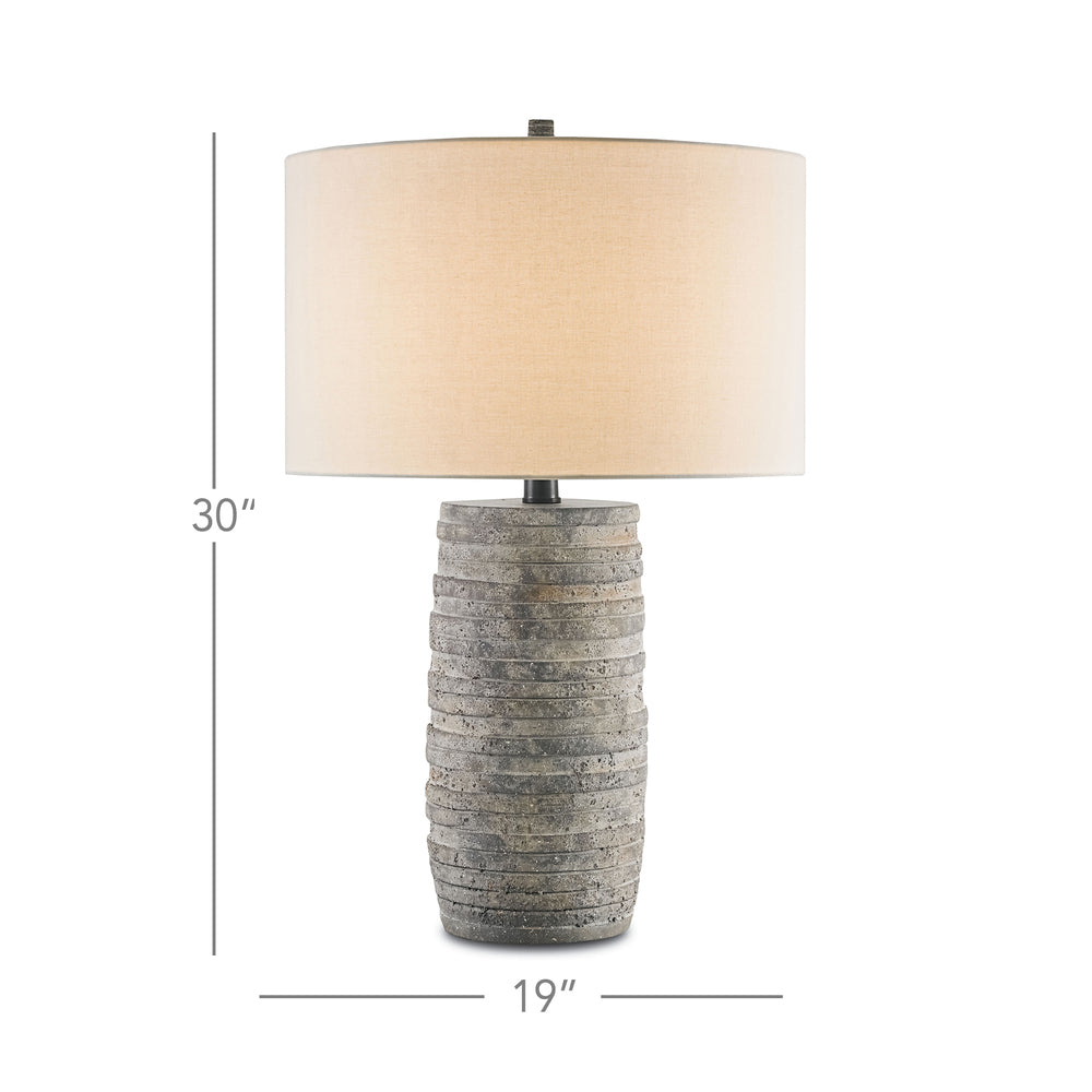 Flat discs of terracotta encircle a wrought iron spine on our Innkeeper Table Lamp. The rustic feel of this natural material means it has subtle variations in color and texture. The gray lamp is topped with a vanilla linen shade held in place by a terracotta finial.