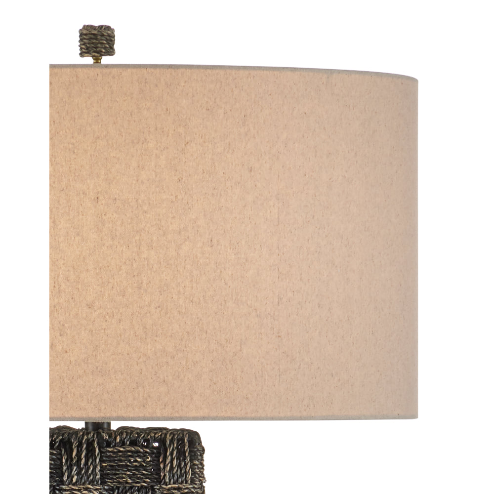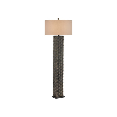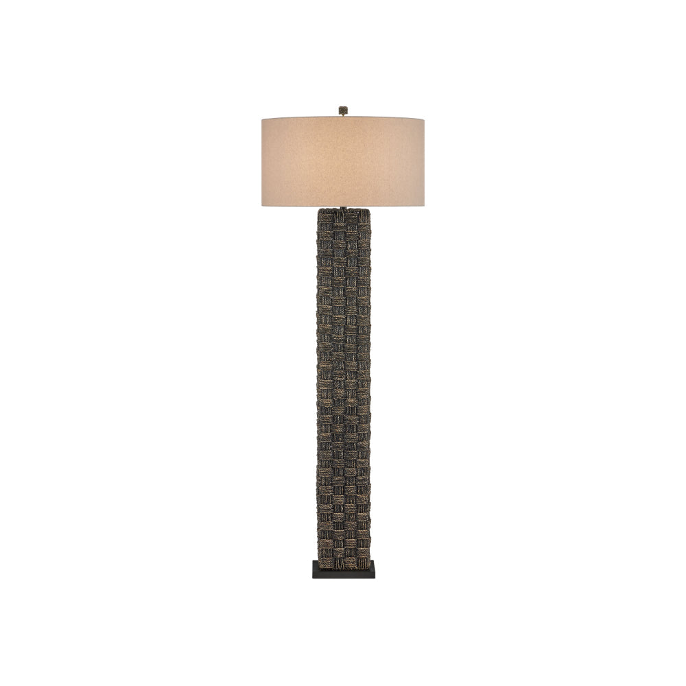 The Eden Floor Lamp features a tall rectangular column crafted from seagrass that has been hand-twisted, painted black, and intricately woven into a gingham pattern by skilled artisans. The richly textured surface rises from a simple black-painted wood base. A linen drum shade softens the look and highlights the lighter tones in the natural fibers, while a coordinating finial wrapped in matching seagrass completes the design with thoughtful detail.