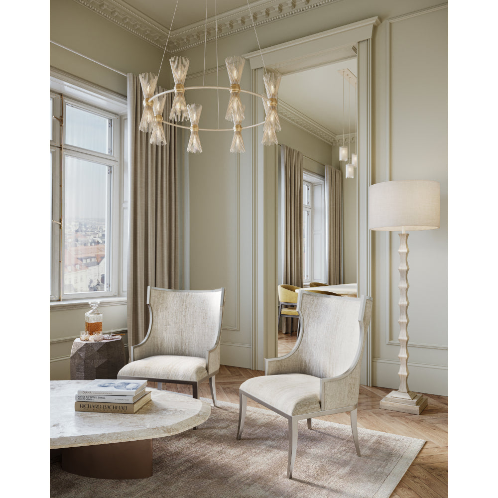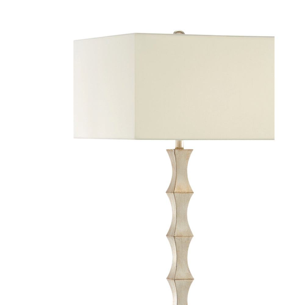 The Lyndhurst Floor Lamp has a simple bone-like spine that is beautifully finished in silver leaf to bring the knobby column a lustrous glow. Held in place with a matching finial, the rectangular off-white shantung shade is wide enough to cast its illumination onto the entire frame of the silver floor lamp.