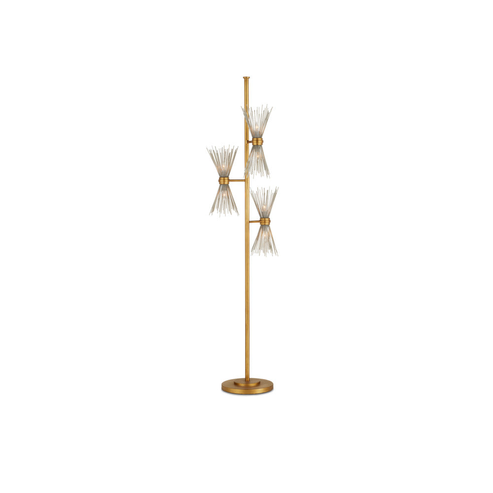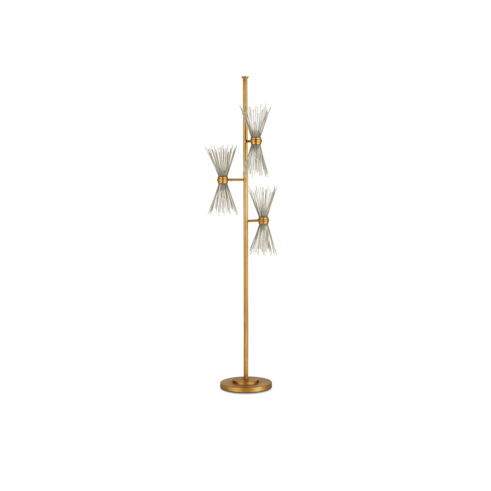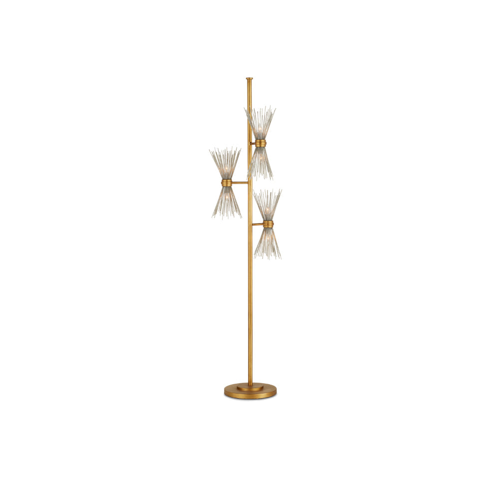 Angling away from articulated clasps, the shades of our Novatude Floor Lamp effervesce. The wrought iron frame in an antique gold leaf finish contrasts the spikes covering the bulbs in a gleaming contemporary silver leaf finish. In this way, opposites attract in the design of this gold floor lamp. We also offer the Novatude as a chandelier.