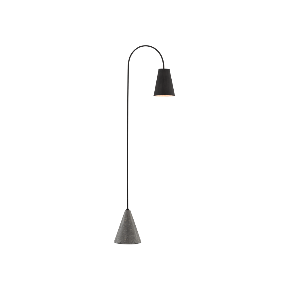 The Lotz Floor Lamp in the shape of a shepherd's crook is made of wrought iron in a black iron finish. The weighty base is made of polished concrete. A refined design note that brings its illumination greater brilliance is the interior of the shade that is covered in a silver leaf finish.