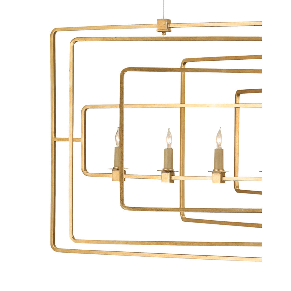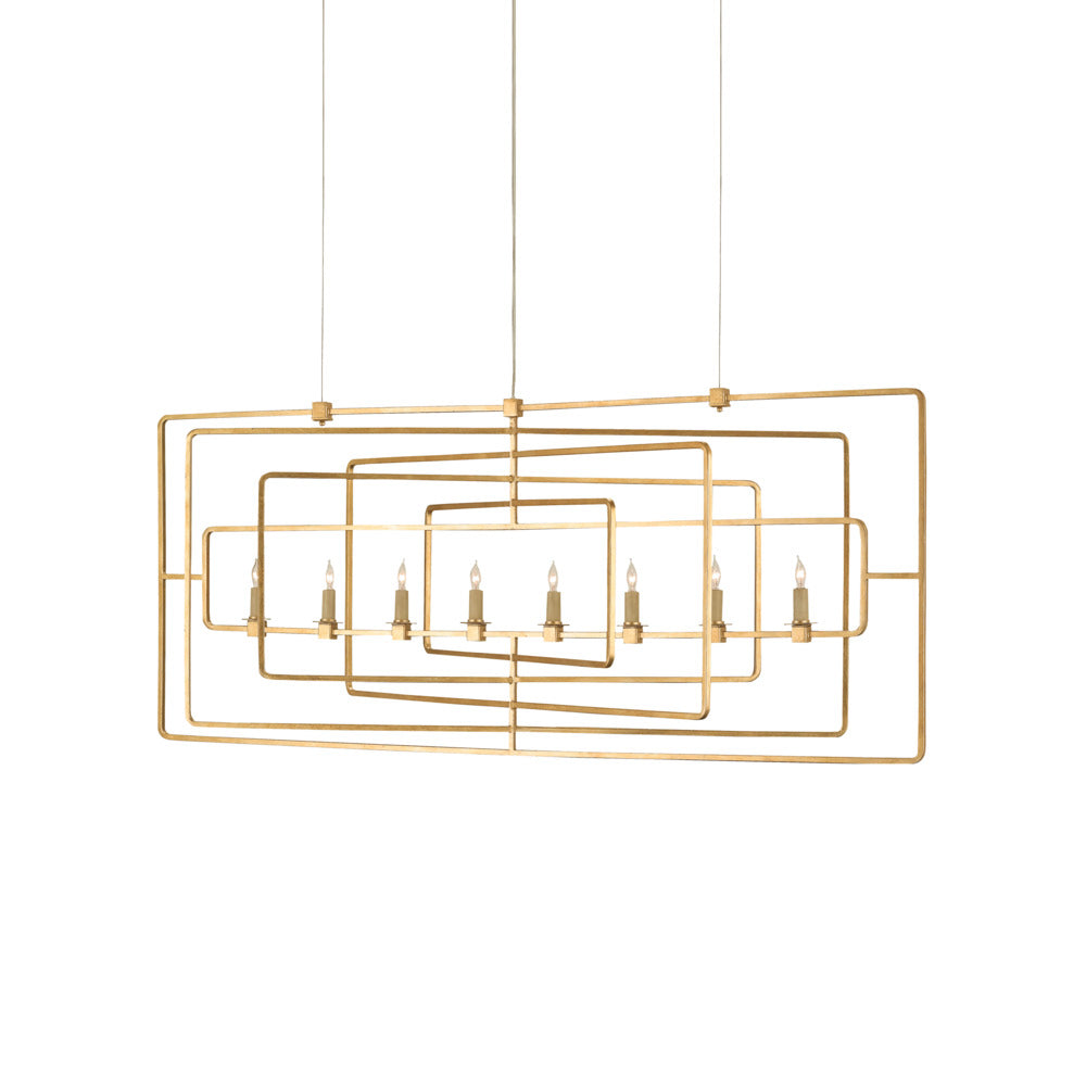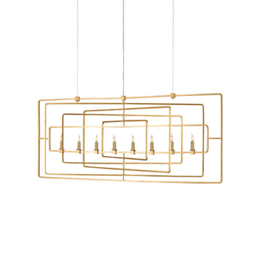 Paris International Style was all the rage in the 1930s, and our contemporary new twist on it is the Metro Gold Rectangular Chandelier in a rich contemporary gold leaf finish. The elongated linear shape and the interlocking rectangles of wrought iron that form the frame of the gold chandelier salute early modernism. We offer the Metro in a number of other variations.