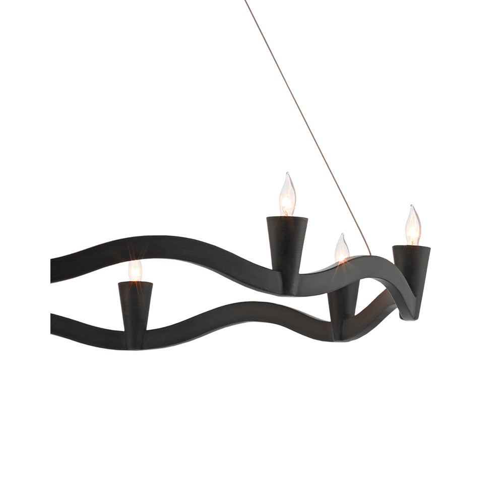 Our Serpentina Chandelier is made of wrought iron in an antique black finish. The lightness of this design stems from the aircraft cable that suspends the serpentine bottom ring from the plumb bob-like top cap on this black chandelier. We also offer the Serpentina as a white chandelier.