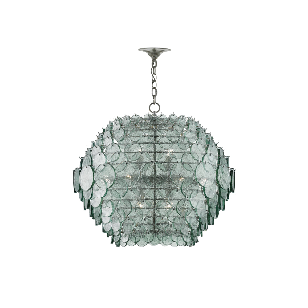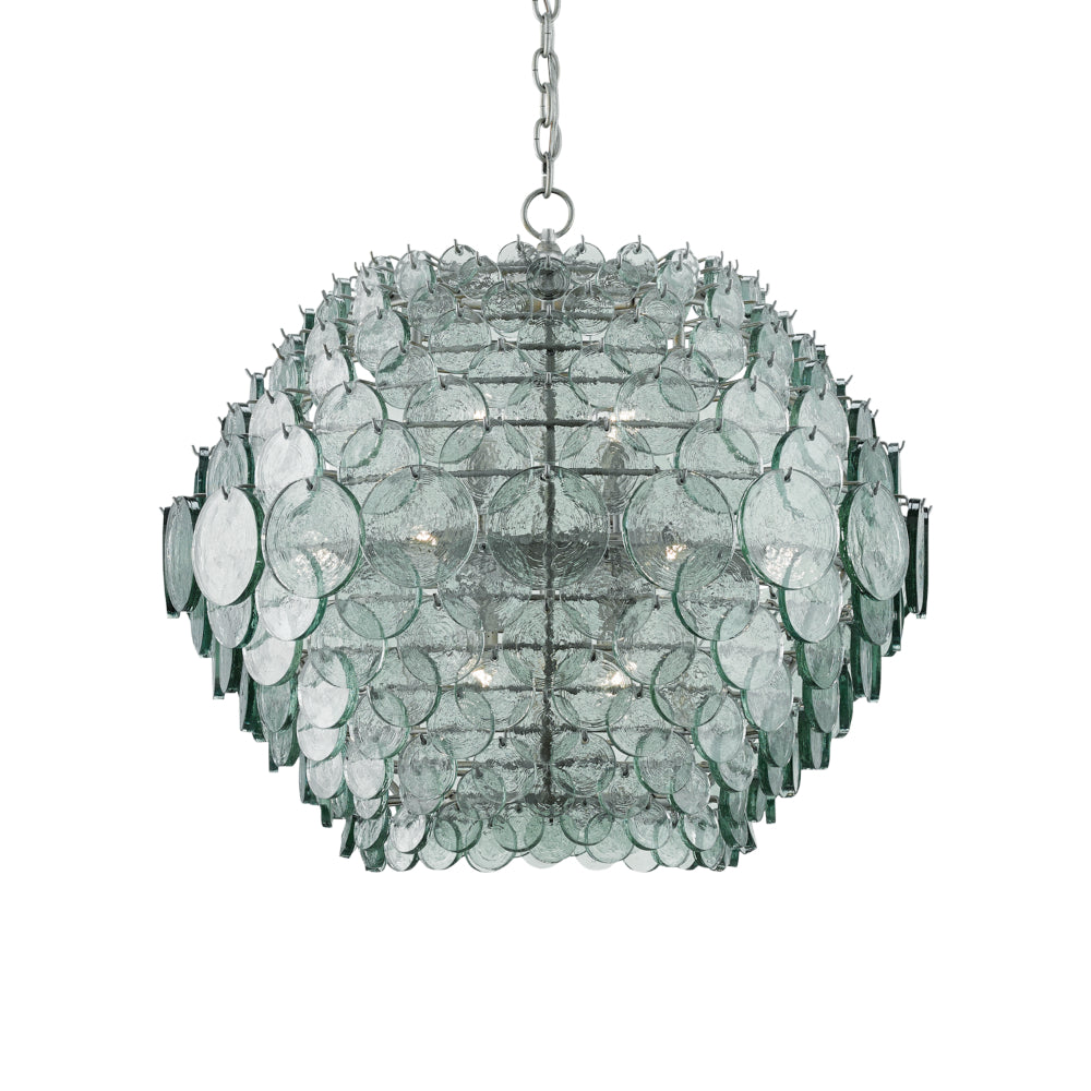 Recycled glass discs dangle from the Braithwell Chandelier to form a textural shade. The discs vary in size and overlap on the wrought iron frame in a silver Granello finish to turn this glass chandelier into a mottled mosaic. We also offer the Braithwell in a flush-mount.
