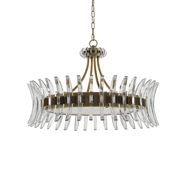 The Coquette Chandelier is a modern iteration of Art Deco artistry made of slices of optic crystal and metal in an antique brass finish. The crystal blades that line the brass chandelier read like half-moon slivers to bring the fixture a luminous warm-cool sense of glamour.