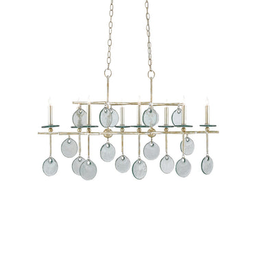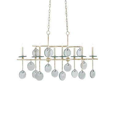 The Sethos Silver Rectangular Chandelier has a linear wrought iron frame in a silver Granello finish that refences early American antiques. This and the discs of recycled glass dangling from its arms bring the silver chandelier a nostalgic feel. We offer the Sethos in a number of designs and in a variety of finishes.