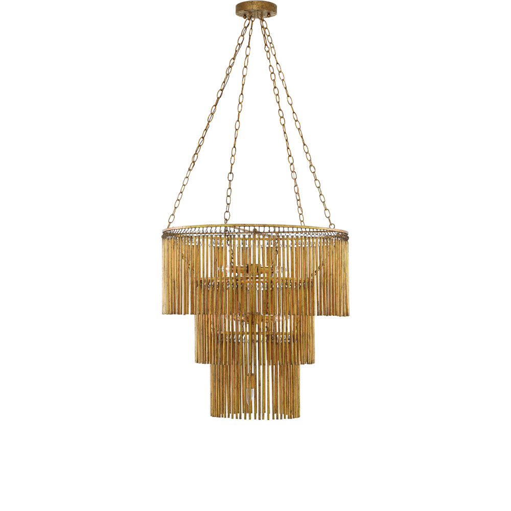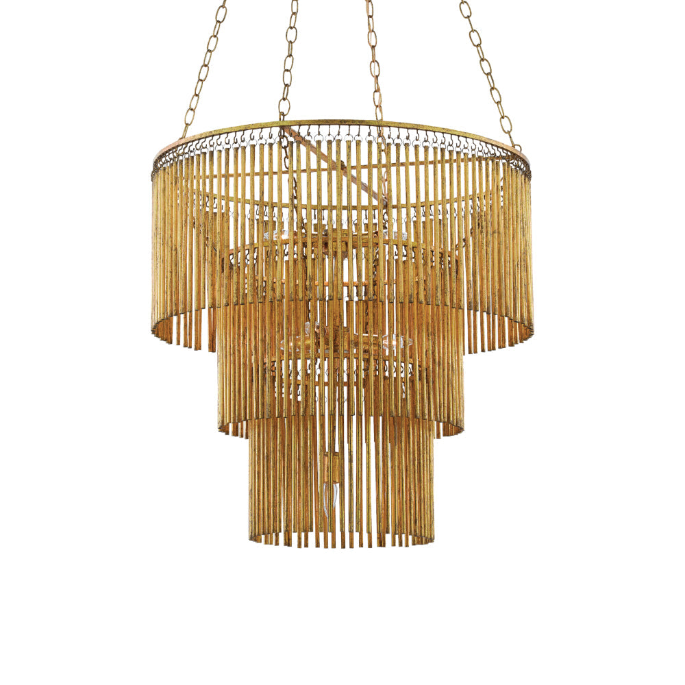 The Mantra Chandelier is an elegant example of mid-century modern luxe. The gold leaf finish on the long tentacles of metal that dangle from its three tiers bring the fixture a powerful punch of patina. This is due to the distressing our finish artisans achieved with this gold chandelier.