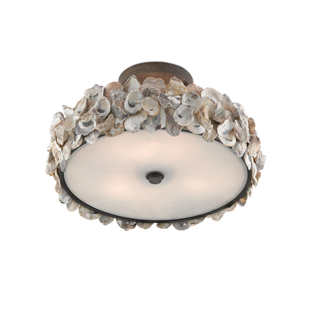 Our Oyster Semi-Flush with its ring of natural oyster shells bursting with seaside tones and textures has a robust charm. The simplicity and rusticity of the wrought iron frame in a textured bronze finish make this shell semi-flush a commanding ceiling light. We also have a chandelier in this family of fixtures.