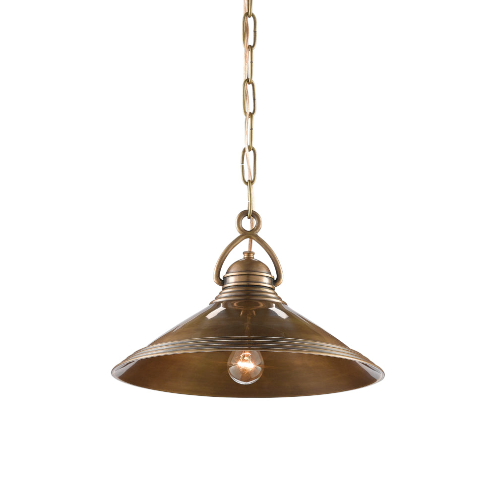 The Weybright Pendant references vintage industrial style. Made of brass in a vintage brass finish, the design notes that make this brass pendant so special include the sophisticated shape of the hook that fastens the fixture to the chain and the ribbed details on the shade.